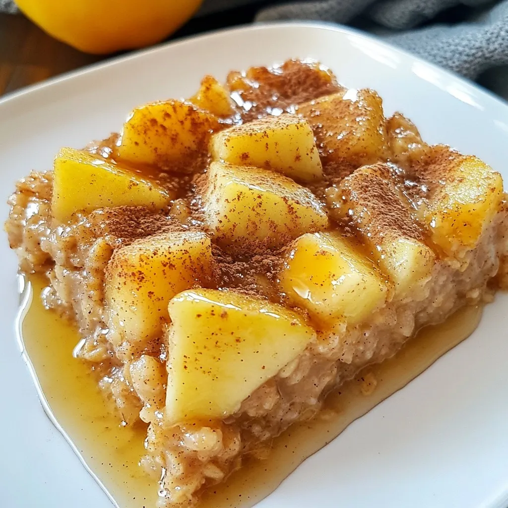 A warm and comforting baked oatmeal dish featuring apples and cinnamon, perfect for breakfast or a snack.