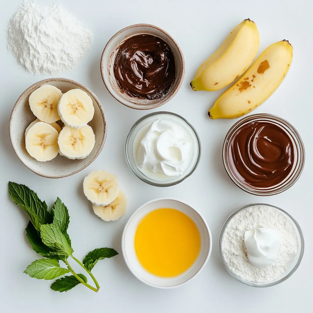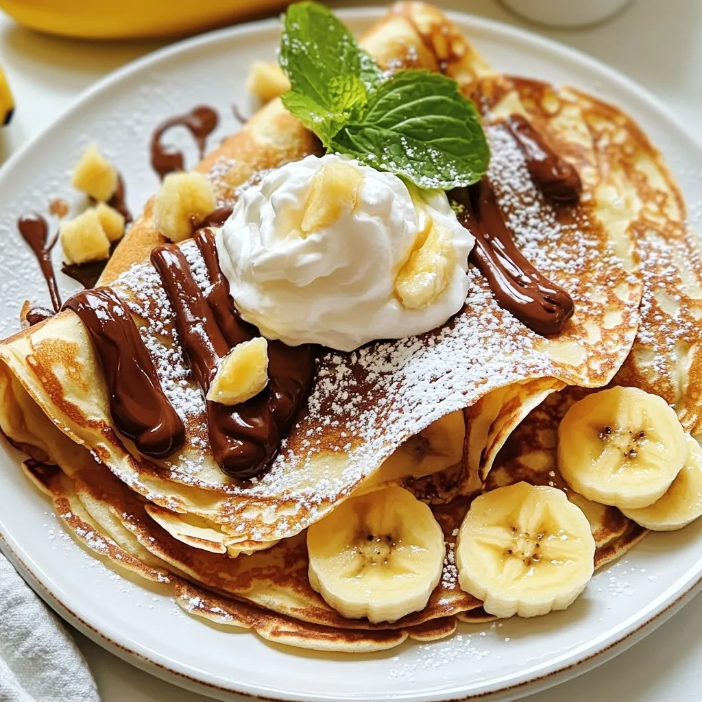 To make Banana Nutella crepes, gather these ingredients first. The flour gives the crepes structure. Eggs add richness, while milk keeps them soft. Melted butter helps with flavor and texture. Sugar sweetens the batter. Salt balances the taste. Bananas and Nutella create the delicious filling. Finally, whipped cream and mint add a nice touch.