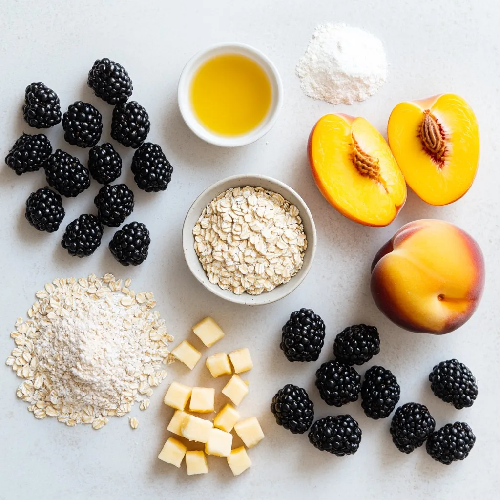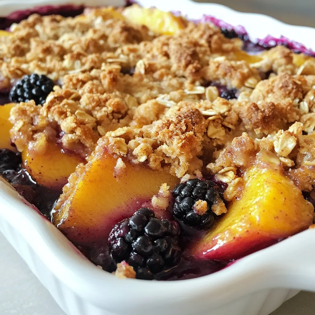 - 2 cups ripe blackberries - 2 cups fresh peaches, peeled and sliced - 1 tablespoon fresh lemon juice - 1/3 cup granulated sugar - 1 cup rolled oats - 1/2 cup all-purpose flour - 1/2 cup packed brown sugar - 1 teaspoon ground cinnamon - 1/2 cup unsalted butter, softened and cut into small cubes - Pinch of salt This recipe is simple. You need exact amounts for the best flavor. Ripe blackberries and fresh peaches make the crisp shine. Use a measuring cup for accuracy when scooping ingredients. - For the fruits, 2 cups each gives a good mix. - The lemon juice adds brightness. Just a tablespoon will do. - The sugars sweeten the fruit. You need 1/3 cup of granulated sugar and 1/2 cup brown sugar for the topping. - The oats and flour are key for the crunch. Both should be measured well for the right texture. Fresh fruit gives the best taste and texture. Ripe blackberries and peaches bring a lovely sweetness. Frozen fruit works in a pinch but changes the crisp's texture. If you use frozen, thaw and drain excess water first. This keeps your crisp from getting soggy. Both options can work, but fresh is my top choice for flavor! {{ingredient_image_2}} Start by preheating your oven to 350°F (175°C). This helps the crisp cook evenly. In a large bowl, mix 2 cups of ripe blackberries and 2 cups of sliced peaches. Add 1 tablespoon of fresh lemon juice and 1/3 cup of granulated sugar. Toss gently until the fruit is well-coated. The lemon juice brightens the flavors and balances the sweetness. Next, grease a 9x13 inch baking dish with butter or non-stick spray. Spread your fruit mixture evenly in the dish. In a separate bowl, mix 1 cup of rolled oats, 1/2 cup of all-purpose flour, 1/2 cup of packed brown sugar, 1 teaspoon of ground cinnamon, and a pinch of salt. Stir these dry ingredients well. Now, add 1/2 cup of softened butter, cut into small cubes. Use your fingers or a pastry cutter to mix until it looks like coarse crumbs. This gives the topping a nice texture. Sprinkle the oat mixture evenly on top of the fruit layer. Make sure you cover the fruit completely. Now, place the baking dish in the oven. Bake for 30 to 35 minutes. Look for a golden brown topping and bubbling fruit juice around the edges. Once done, take it out and let it cool for about 10 minutes. This allows the juices to thicken a bit before serving. Enjoy your warm blackberry peach crisp! To get the best crisp, use cold butter. Cold butter helps create a flaky topping. Make sure your oats are rolled oats. They give a wonderful chewy texture. Mix until the topping looks like wet sand. You want some larger chunks for extra crunch. Avoid overmixing, so it stays light and airy. Serve your blackberry peach crisp warm from the oven. Use individual bowls for a nice touch. A scoop of ice cream on top makes it special. You can also add a sprinkle of cinnamon for extra flavor. For a fun twist, add nuts to the topping. They add a great crunch and taste. Ice cream is a classic choice. Vanilla pairs perfectly with the sweet and tart crisp. Whipped cream is another lovely option. It adds a light and creamy texture. Try flavored ice creams like peach or berry for a fun twist. Always serve these toppings fresh for the best taste. Pro Tips Use Fresh Fruit: Always opt for ripe, seasonal blackberries and peaches for the best flavor and sweetness in your crisp. Customize Your Topping: Feel free to add chopped nuts or coconut flakes to the oat mixture for an extra crunch and flavor dimension. Let It Rest: Allow the crisp to cool for at least 10 minutes after baking; this helps the juices thicken, making it easier to serve. Serving Suggestions: Enhance your crisp by serving it warm with a scoop of vanilla ice cream or a dollop of whipped cream for a delightful treat. {{image_4}} You can change the fruits in this crisp. Try using blueberries, strawberries, or apples. Each fruit gives a unique flavor and texture. Mix and match to find your favorite combo. If you want a twist, add some raspberries for a tart kick. Just remember to keep the fruit ratio the same. To make a gluten-free crisp, swap the all-purpose flour. Use almond flour or a gluten-free blend instead. Check that your oats are certified gluten-free for safety. This keeps the crunch while making it safe for those with gluten issues. You will still enjoy a tasty dessert with a different texture. For a vegan version, replace the butter with coconut oil or a vegan butter. Also, use maple syrup or agave syrup instead of granulated sugar. This keeps the sweetness while being plant-based. You can also add nuts like pecans or walnuts for extra crunch. Enjoy a warm dessert that fits your diet! After you enjoy your blackberry peach crisp, let it cool completely. Store any leftovers in a clean container. Cover it tightly with a lid or plastic wrap. It keeps well in the fridge for up to three days. This way, you can enjoy your dessert later without losing flavor. When you're ready to eat the leftovers, preheat your oven to 350°F (175°C). Place your crisp in an oven-safe dish. Cover it with foil to prevent it from browning too much. Heat for about 15 to 20 minutes. Check if it’s warm all the way through. You can also microwave individual portions for about 30 to 45 seconds. If you want to save some for later, freezing works great! First, let the crisp cool completely. Then, cut it into portions. Wrap each piece in plastic wrap and place them in a freezer bag. Remove as much air as you can. Your blackberry peach crisp can stay good for up to three months in the freezer. When you’re ready to enjoy it, thaw it overnight in the fridge before reheating. To add more tang, use extra lemon juice. You can also mix in some sour cherries. Their tartness will balance the sweetness of the blackberries and peaches. Try adding a touch of lemon zest for a bright flavor boost. Adjust these based on your taste! Blackberry peach crisp pairs well with many things. A scoop of vanilla ice cream is a classic choice. Whippe