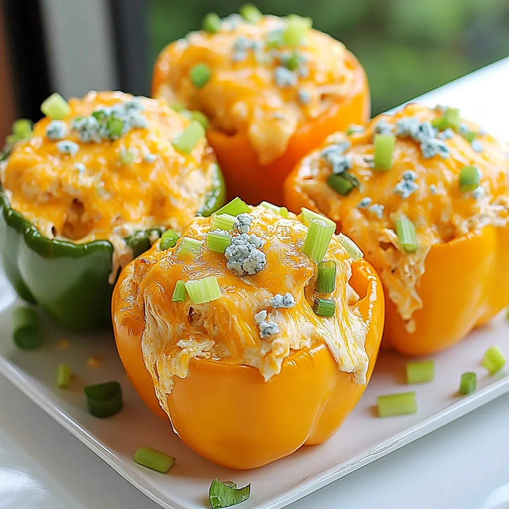 - 4 large bell peppers (red, yellow, or green) - 2 cups cooked, shredded chicken - 1/2 cup buffalo sauce - 1 cup cream cheese - 1 cup shredded sharp cheddar cheese - 1/2 cup green onions - 1/4 cup celery - Blue cheese crumbles for topping - Additional buffalo sauce for serving - You can use rotisserie chicken, canned chicken, or turkey instead of shredded chicken. - For a dairy-free option, try using cashew cream or a dairy-free cream cheese. - If you prefer less heat, use a mild buffalo sauce or mix in some ranch dressing. When you think about the ingredients, it’s all about balance. The bell peppers add a sweet crunch. The chicken brings protein, and the buffalo sauce gives that spicy kick. Cream cheese makes it creamy and rich. Cheddar cheese adds a sharp flavor that ties it together. Feel free to get creative! You can mix in other veggies or spices to make it your own. The options are endless. Just remember to keep the flavors in check to ensure a tasty dish. {{ingredient_image_2}} 1. Preheat the oven to 375°F (190°C). This ensures even cooking for our peppers. 2. Prepare the bell peppers. Slice off the tops and remove seeds and membranes. Stand them upright in a large baking dish to keep them stable. 3. In a large mixing bowl, combine shredded chicken and buffalo sauce. Stir until well mixed. 4. Next, mix in the cream cheese, half of the shredded cheddar cheese, green onions, diced celery, garlic powder, and a pinch of salt and pepper. Make sure everything blends well. 5. Fill each pepper with the buffalo chicken mixture. Pack it tightly and let it mound a bit on top for a nice look. 6. Top the filled peppers with the remaining cheddar cheese. Make sure each one is well-covered. 7. Loosely cover the dish with aluminum foil to keep moisture in. Bake for 30 minutes. This helps all the flavors mix together. 8. After 30 minutes, take off the foil. Continue baking for another 10-15 minutes. The cheese should be bubbly and golden brown when done. Let the stuffed peppers cool for about 5 minutes before serving. If you want, sprinkle blue cheese crumbles on top for extra flavor. Enjoy this spicy and satisfying meal! To keep your peppers upright, trim a small slice off the bottom. This helps them stand steady in the baking dish. When you prepare the filling, use a large bowl. Mix the chicken and buffalo sauce well before adding other ingredients. This ensures every bite is packed with flavor. For a beautiful presentation, serve the stuffed peppers on a vibrant platter. Add a drizzle of buffalo sauce on top for color. Garnish with chopped green onions for a fresh touch. Pair these peppers with a simple side salad or some crispy veggies. They balance the heat and add crunch. If you want milder peppers, use less buffalo sauce. Start with a quarter cup and taste before adding more. For those who love heat, go wild with the sauce. You can also add toppings like blue cheese crumbles. They add a creamy contrast to the spicy filling. Pro Tips Choosing the Right Peppers: Opt for firm, fresh bell peppers for the best texture and flavor. Look for ones with smooth skin and vibrant color. Adjusting Heat Levels: If you prefer a milder dish, use less buffalo sauce or opt for a milder variety. You can also mix in some ranch dressing to balance the heat. Make Ahead: Prepare the stuffed peppers in advance and store them in the refrigerator. Just bake them the next day when you're ready to eat! Adding Extra Flavor: Enhance the stuffing by adding additional spices like paprika or cayenne pepper, or even some chopped jalapeños for extra kick. {{image_4}} You can make a tasty vegetarian version of these stuffed peppers. Start by using jackfruit as a substitute for chicken. Jackfruit has a meaty texture and soaks up flavors well. For added crunch and nutrition, mix in more vegetables. Try diced zucchini, corn, or even black beans. These options keep the dish satisfying and full of flavor. If you want to switch up the protein, turkey or beef works great too. Ground turkey is lean and cooks easily, while beef adds a rich taste. For a vegan option, consider plant-based proteins. Crumbled tempeh or lentils can replace chicken nicely. Just mix them with buffalo sauce and cream cheese alternatives for a creamy filling. You can also experiment with different flavors in your stuffed peppers. Add unique seasonings like cumin or smoked paprika for depth. Mixing in ranch dressing can create a creamy and tangy twist. Don't be afraid to get creative with spices. A dash of cayenne pepper or hot sauce can bring more heat if you like it spicy. Each variation can make the dish feel fresh and exciting every time you prepare it. To keep your buffalo chicken stuffed peppers fresh, place them in an airtight container. You want to make sure they are tightly sealed. Store them in the fridge for up to 3 to 4 days. This way, you can enjoy them later without losing flavor. If you want to save stuffed peppers for later, freezing works well. Wrap each pepper tightly in plastic wrap or foil. Then, place them in a freezer-safe bag. They can last for up to 3 months in the freezer. When you are ready to eat them, thaw them in the fridge overnight. To reheat your stuffed peppers, you have a couple of options. The oven gives the best texture. Preheat the oven to 350°F (175°C) and bake them for about 20 minutes. Cover them with foil to keep them moist. If you need a faster option, you can use the microwave. Place the pepper on a microwave-safe plate. Heat for about 2-3 minutes, checking halfway. This method is quick but may make the pepper a bit softer. Choose the method that suits your time and texture preference! You can prep the stuffed peppers ahead of time. Start by making the filling. Mix the shredded chicken, buffalo sauce, cream cheese, and veggies as usual. Then, stuff the peppers. Place them in a baking dish and cover with plastic wrap. Store them in the fridge for up to 24 hours. When ready to cook, bake them for about 40-45 minut