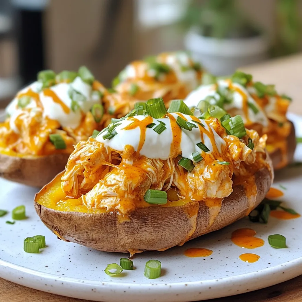 - 4 medium sweet potatoes - 2 cups cooked chicken, shredded - 1/2 cup buffalo sauce (adjust according to your spice tolerance) - 1/2 cup Greek yogurt - 1/2 cup shredded sharp cheddar cheese - 1/4 cup finely chopped green onions - Salt and black pepper to taste - Optional: Fresh cilantro leaves for garnish Sweet potatoes shine in this dish. They are sweet, creamy, and nutritious. Choose medium-sized ones for easy handling. They should feel firm and have smooth skin. For the chicken, shredded is best. You can use leftover chicken or store-bought rotisserie chicken. It cuts down on prep time and adds flavor. Buffalo sauce is key for that signature kick. I recommend Frank’s RedHot or Texas Pete for their balance of flavor and spice. If you like it hot, go for a spicier brand. Greek yogurt adds creaminess and tang. Look for full-fat or plain varieties. Fage and Chobani are great choices. They have a rich taste and smooth texture. Gathering these ingredients will set you up for success. Each one plays a part in making these stuffed sweet potatoes a hit! {{ingredient_image_2}} 1. Preheat your oven to 400°F (200°C). This step is key for a good bake. 2. Wash the sweet potatoes well under running water. This removes dirt and grit. 3. Dry each potato with a towel. Use a fork to pierce each potato several times. This lets steam escape while baking. 4. Place the sweet potatoes on a baking sheet lined with parchment paper. This makes cleanup easy. 5. Bake the sweet potatoes for 45 to 60 minutes. They are done when soft and can be pierced easily with a fork. 1. While the sweet potatoes bake, grab a mixing bowl. 2. Add the shredded chicken to the bowl. Pour in the buffalo sauce. 3. Stir the chicken and sauce well. Make sure the chicken gets fully coated. Adjust the buffalo sauce based on your heat preference. You can add more for a spicy kick or less for a milder flavor. 1. After baking, take the sweet potatoes out of the oven. Let them cool for about 5 minutes. 2. Use a sharp knife to slice each potato lengthwise down the middle. Be careful to not cut all the way through. 3. Use a fork to gently mash some of the flesh inside the potato. This creates space for the filling. 4. Spoon the buffalo chicken mixture into each potato pocket. Fill them generously. 5. Top with a dollop of Greek yogurt, a handful of shredded cheddar cheese, and a sprinkle of chopped green onions. This adds flavor and color. 1. Put the stuffed sweet potatoes back into the oven for about 10 minutes. This melts the cheese and makes it bubbly. 2. Keep an eye on them; they are done when the cheese is melted and golden. To achieve perfectly tender sweet potatoes, follow these tips: - Choose medium-sized sweet potatoes for even cooking. - Pierce each potato with a fork to let steam escape. - Bake at 400°F for 45 to 60 minutes. Check for softness with a fork. Balancing buffalo sauce flavors is key. Here’s how: - Start with a mild buffalo sauce if you're sensitive to heat. - Adjust the amount of sauce based on your spice tolerance. - Mix in Greek yogurt for creaminess and a cooling effect. Serve your stuffed sweet potatoes on a bright platter. This makes them pop visually. - Drizzle extra buffalo sauce over the stuffed potatoes for a bold look. - Place chopped green onions on top to add color and freshness. Best garnishes include: - Fresh cilantro leaves for a burst of flavor. - Extra shredded cheese for a cheesy finish. For efficiency in the kitchen, use these tools: - A sharp knife to slice sweet potatoes easily. - A mixing bowl for combining chicken and sauce. - Parchment paper for easy cleanup on your baking sheet. Consider these alternative cooking methods: - Microwave sweet potatoes for quicker cooking. - Grill them for a smoky flavor and charred skin. Pro Tips Choose the Right Sweet Potatoes: Select firm, unblemished sweet potatoes for the best flavor and texture. Look for ones that are similar in size for even cooking. Customize Your Spice Level: Adjust the amount of buffalo sauce based on your preference. Start with a smaller amount and add more if you like it spicier! Add Extra Flavor: Try mixing in some crumbled blue cheese or ranch dressing into the buffalo chicken filling for a creamier texture and added flavor. Presentation Matters: For an appealing presentation, serve the stuffed sweet potatoes on a colorful platter and drizzle with extra buffalo sauce before serving. {{image_4}} For a vegetarian twist, swap the chicken with cooked quinoa or black beans. Both options pack a punch of protein and fiber. If you want a vegan version, use plant-based chicken substitutes mixed with buffalo sauce. Greek yogurt can be replaced with dairy-free yogurt. For gluten-free meals, all ingredients listed are naturally gluten-free. Just check the buffalo sauce label to ensure it meets your needs. Feel free to play with different sauces. Try barbecue sauce for a sweeter take or ranch for a creamy twist. You can mix in veggies like bell peppers or spinach into the buffalo chicken filling for added nutrients. Consider adding some diced celery or carrots for crunch. Don't forget to taste as you go to get the flavors just right. These stuffed sweet potatoes pair great with a fresh garden salad or crispy coleslaw. They add a nice crunch and balance to the meal. For drinks, a cold beer or a refreshing iced tea complements the flavors well. If you prefer non-alcoholic options, a fizzy lemonade works nicely too. Enjoy experimenting with these ideas. To keep your Buffalo Chicken Stuffed Sweet Potatoes fresh, store them in the fridge. Place them in an airtight container. They will stay good for about 3 to 4 days. If you want to store them longer, consider freezing. Wrap each stuffed potato tightly in foil or plastic wrap. Then, place them in a freezer-safe bag. They can last up to 2 months in the freezer. When ready to eat, reheat the stuffed sweet potatoes in the oven. Preheat your oven to 350°F (175°C). Place the potatoes on a baking sheet an