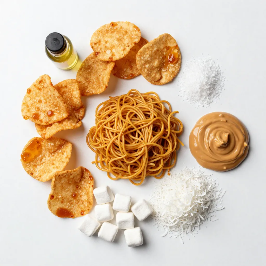 To make Butterscotch Haystack Cookies, you need simple ingredients. Each item plays a key role in flavor and texture. Chow mein noodles give a crunchy base. Butterscotch chips add sweetness and richness. Creamy peanut butter brings a smooth, nutty taste. Unsweetened shredded coconut adds a chewy element. Mini marshmallows offer bursts of sweetness. Vanilla extract enhances the overall flavor. A pinch of sea salt balances everything perfectly.