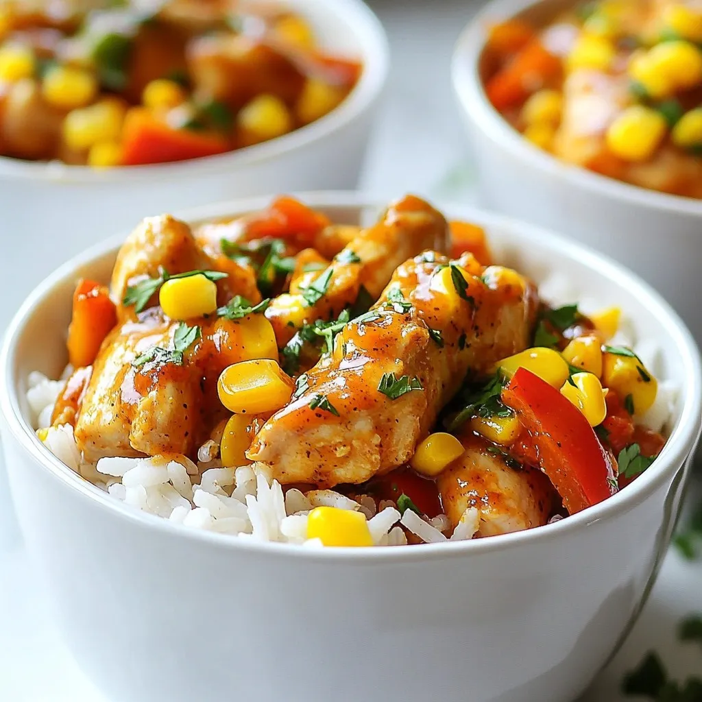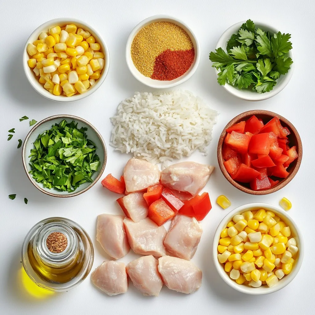 In a spacious mixing bowl, combine the chopped chicken pieces, long-grain rice, diced bell pepper, corn, finely diced onion, and minced garlic.
