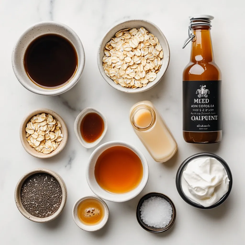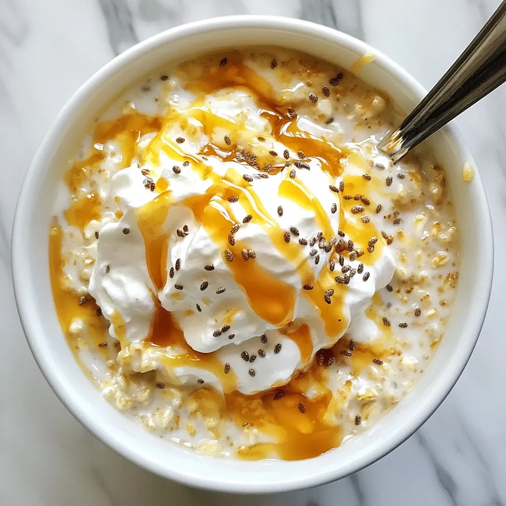 - 1 cup rolled oats - 1 ½ cups almond milk (or milk of your choice) - 1 teaspoon vanilla extract - 1 tablespoon maple syrup (or honey) - 1 tablespoon brewed coffee (cooled) - 2 tablespoons caramel sauce (store-bought or homemade) - 1 tablespoon chia seeds (optional, for texture) - A pinch of salt - Whipped cream (optional, for topping) - Additional caramel sauce for drizzling (for garnish) You can swap almond milk for any milk you like. Oat milk, coconut milk, or regular cow's milk work great. If you want it sweeter, use more maple syrup or honey. For the coffee, cold brew works well too. If you don’t have caramel sauce, try using a chocolate sauce instead. Chia seeds add texture, but you can skip them if you prefer plain oats. Using fresh and quality ingredients makes a big difference in taste. Choose rolled oats that are whole and not overly processed. Fresh almond milk adds a nice creaminess. When selecting maple syrup, pick pure syrup for the best flavor. Always go for high-quality coffee, as this will give your oats a rich taste. Good ingredients lead to delicious results! {{ingredient_image_2}} To start, gather your ingredients. You will need rolled oats, almond milk, vanilla extract, maple syrup, brewed coffee, caramel sauce, chia seeds, and salt. This recipe takes about 10 minutes to prep. You will then chill it overnight. This makes it simple and easy for busy mornings. In a medium bowl or jar, add the rolled oats and almond milk. Next, pour in the vanilla extract and maple syrup. Then, add the cooled brewed coffee, chia seeds, and a pinch of salt. Mix it well. Make sure everything blends nicely. Now, take 1 tablespoon of caramel sauce and incorporate it gently. This will create pretty swirls. Be careful not to mix too much. You want to see the caramel design. Cover your bowl or jar tightly. Then, place it in the refrigerator. Let it chill for at least four hours or overnight. This helps the oats soak up the milk and flavors. The next morning, take it out and stir well. If you like it creamier, add a splash of milk. For serving, you can add whipped cream on top. Drizzle with more caramel sauce for an extra treat. Enjoy your caramel macchiato overnight oats right from the jar or in a bowl! To get the best texture for your caramel macchiato overnight oats, use rolled oats. They absorb liquid well and stay chewy. If you want more creaminess, add more milk. A tablespoon of chia seeds helps too. They soak up the liquid and create a lovely thickness. Mix everything well, but don’t over-stir when adding caramel. Keep those pretty swirls visible! You can make these oats even tastier by adding a few things. Cinnamon gives a warm spice note. A dash of cocoa can add a chocolatey twist. Try a scoop of nut butter for richness. If you want a coffee kick, use espresso instead of brewed coffee. Feel free to experiment! Each addition can change the flavor. Make your oats look as good as they taste. Use a clear jar so you can see the layers. Top with whipped cream for a fluffy finish. Drizzle extra caramel on top for sweetness. You can also add coffee beans or chocolate shavings for a fun touch. This not only looks nice but adds extra flavor too! Pro Tips Use Fresh Coffee: For the best flavor, use freshly brewed coffee and let it cool before adding it to the oats. Customize Sweetness: Adjust the amount of maple syrup or honey based on your personal taste preference. Add Nuts for Crunch: Consider adding chopped nuts like almonds or walnuts for an extra crunch and nutritional boost. Make It Vegan: Substitute honey with maple syrup and use plant-based whipped cream to keep it completely vegan. {{image_4}} You can use many types of milk for your overnight oats. Almond milk is great, but don’t stop there! Try oat milk or soy milk for a creamy taste. Coconut milk gives a tropical twist. Each milk adds a unique flavor. Choose what you love best! Why not boost the flavor? Add a pinch of cinnamon for warmth. A scoop of cocoa powder can turn your oats into a chocolate delight. Toss in some nuts or seeds for crunch. You can also use flavored coffee for more kick. Mix and match to find your favorite combo! As the seasons change, so can your oats! In fall, add pumpkin spice for a cozy vibe. In spring, mix in fresh berries for a fruity kick. Winter calls for peppermint extract to brighten your mornings. Each season offers fun ways to enjoy your caramel macchiato overnight oats! To keep your caramel macchiato overnight oats fresh, store them in a jar or bowl with a lid. This helps lock in flavor and moisture. You can make a batch for the week and enjoy them each morning. Just remember to stir well before eating. In the refrigerator, these oats last about 3 to 5 days. This gives you time to enjoy your breakfast without rush. If you notice any odd smells or signs of spoilage, it’s best to throw them away. Freshness matters! You can freeze overnight oats for up to 3 months. Use freezer-safe jars or containers. Make sure to leave some space at the top for expansion. To thaw, place them in the fridge overnight. If you’re in a hurry, you can also microwave them for a minute. Just stir well and enjoy! Yes, you can use instant oats instead of rolled oats. Instant oats cook faster and absorb liquid quickly. This makes them softer in texture. However, the taste may vary. Rolled oats have a hearty texture that enhances the overall experience. If you prefer instant oats, adjust the liquid amount slightly. Start with less milk and increase as needed. To make this recipe dairy-free, simply use almond milk or any plant-based milk. Options like oat milk or coconut milk work well too. They add unique flavors and creaminess. Ensure the caramel sauce is also dairy-free. Many brands offer vegan options. This way, you can enjoy your oats without dairy while keeping the taste rich. Absolutely! You can make these oats without coffee. Replace brewed coffee with extra milk for a milder flavor. You might also add a little coc