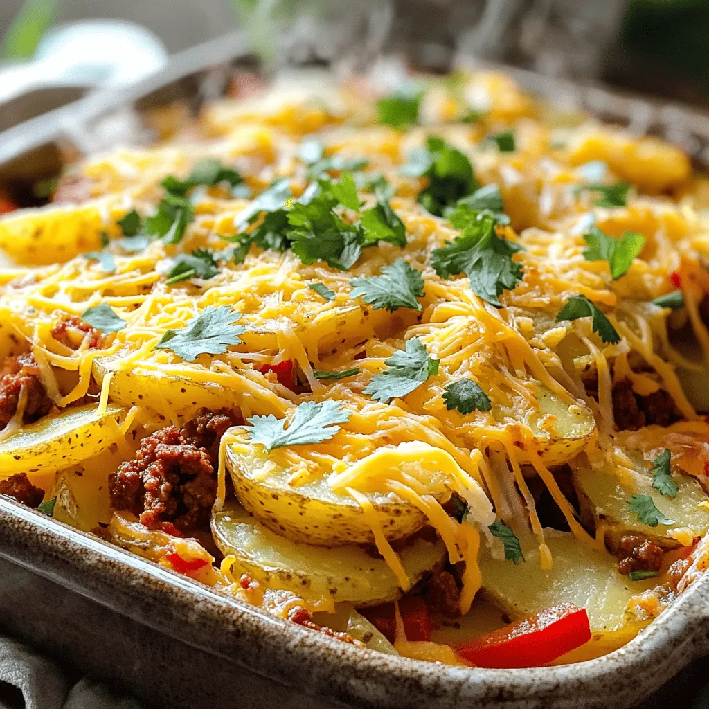 To make a tasty chorizo and potato egg casserole, gather these items: - 1 pound fresh chorizo sausage, casings removed - 3 medium-sized potatoes, diced into small cubes - 1 small onion, finely chopped - 1 red bell pepper, diced - 1 cup shredded sharp cheddar cheese - 6 large eggs - 1 cup whole milk - 1 teaspoon smoked paprika - 1 teaspoon garlic powder - Salt and black pepper to taste - Fresh cilantro or parsley, chopped for garnish (optional) You can swap ingredients if needed. Use turkey chorizo for a leaner option. For a dairy-free version, try almond milk. Instead of cheddar, use pepper jack for extra spice. If you want to skip the potatoes, try sweet potatoes or even a mix of vegetables. I love using Chorizo de San Manuel for its rich flavor. For cheese, Tillamook sharp cheddar is my go-to. When it comes to eggs, I choose Organic Valley for quality. For spices, McCormick offers great options that are always fresh and flavorful. Start by gathering your ingredients. You’ll need fresh chorizo, potatoes, onion, red bell pepper, eggs, milk, cheese, and spices. This makes cooking easier. Preheat your oven to 375°F (190°C). Use a 9x13-inch baking dish and grease it to prevent sticking. 1. Cook the Chorizo: In a large skillet, add the chorizo. Cook it over medium heat for 5 to 7 minutes. Break it into small pieces as it cooks. Once browned, place it on a paper towel to absorb extra grease. 2. Sauté the Vegetables: Use the same skillet. Add the diced potatoes and sauté for about 10 minutes. Stir often until they start to soften. Next, add the chopped onion and red bell pepper. Cook for another 5 minutes until the onion turns clear. 3. Prepare the Egg Mixture: In a large bowl, crack the eggs. Whisk them with the milk, smoked paprika, garlic powder, salt, and black pepper. Mix until it is smooth and well combined. Now, layer the cooked chorizo in the greased baking dish. Spread the sautéed potatoes, onion, and bell pepper on top. Carefully pour the egg mixture over the layers. Make sure it spreads evenly. Finally, sprinkle the shredded cheddar cheese on top. Bake the casserole in the oven for 30 to 35 minutes. It is done when the center is set and the top is golden. After baking, let it cool for about 5 minutes. Then slice into squares for serving. Enjoy your delicious Chorizo & Potato Egg Casserole! For the full recipe, check the previous section. To get the best texture in your chorizo and potato egg casserole, follow these steps: - Cook each layer well. Make sure the chorizo is fully cooked and crumbly. This adds flavor and prevents a greasy dish. - Sauté potatoes until soft. They should be tender before adding them to the casserole. This step helps them cook evenly in the oven. - Whisk eggs and milk thoroughly. This ensures a smooth and creamy mixture that holds everything together. Avoid these common mistakes for a perfect casserole: - Under-cooking the chorizo. If it’s not cooked enough, it can leave a raw taste. - Skipping the sauté step for veggies. Raw veggies can make the casserole watery and crunchy. - Not letting it rest. Allowing the casserole to cool for a few minutes before serving helps it set and makes cutting easier. Serve your chorizo and potato egg casserole for a hearty breakfast or brunch. Here are some tasty ideas: - Garnish with fresh herbs. Cilantro or parsley adds color and freshness. - Add a dollop of sour cream. This brings extra creaminess and balances the spice from the chorizo. - Pair with avocado slices. Creamy avocado complements the flavors and adds healthy fats. For the full recipe, check the detailed instructions above. Enjoy your cooking! {{image_4}} You can make this casserole meatless. Swap chorizo for black beans or lentils. These add protein and flavor. Use the same spices to keep that tasty kick. You can also add more veggies like spinach or mushrooms. They add color and nutrients. The eggs and cheese give it a creamy texture. Want some heat? Add diced jalapeños or a splash of hot sauce. You can mix these into the egg mixture. For a smoky touch, try adding chipotle seasoning. It will make the dish bold and exciting. Adjust the spice level to fit your taste. You can also top it with spicy salsa before serving. To keep it dairy-free, replace cheese and milk with nut milk. Use nutritional yeast instead of cheese for a cheesy taste. There are many nut-based cheeses available too. Ensure your egg substitute works well in baking. This way, everyone can enjoy the casserole. You can still achieve a creamy texture that’s satisfying. Feel free to explore these options! Each variation brings a new twist to the classic Chorizo & Potato Egg Casserole. For more details, check the Full Recipe. Once you finish your Chorizo & Potato Egg Casserole, let it cool. Store leftovers in an airtight container. Place the casserole in the fridge. It will stay fresh for up to four days. Make sure to label the container with the date. This helps you track how long it has been stored. When you are ready to enjoy leftovers, preheat your oven to 350°F (175°C). Cut a portion of the casserole and place it in an oven-safe dish. Cover it with foil to keep it moist. Heat for about 15-20 minutes or until warmed through. You can also reheat individual servings in the microwave. Just warm it for about 1-2 minutes, checking to ensure it is hot all the way through. If you want to save the casserole for later, freezing is a great option. First, let it cool completely. Then, cut it into servings and wrap each piece tightly in plastic wrap. Place the wrapped pieces in a freezer-safe bag or container. The casserole can freeze well for up to three months. When you are ready to eat, let it thaw in the fridge overnight before reheating. For the full recipe, check the earlier sections of this article. Yes, you can make this casserole ahead of time. Prepare it the night before and store it in the fridge. This way, you save time in the morning. Just bake it when you’re ready to eat. It 