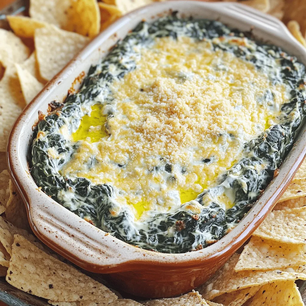 - Spinach: Use 1 cup of fresh spinach, finely chopped. Fresh spinach adds a bright color and flavor. - Garlic: You need 2 cloves of minced garlic. Garlic gives the dip a rich, savory taste. - Cheese: Grate 1 cup of Parmesan cheese. This cheese brings a nutty flavor and creamy texture. - Cream cheese: Grab 1 cup of cream cheese, softened. This makes the base creamy and smooth. - Sour cream: You’ll need 1/2 cup of sour cream. It adds tanginess to the dip. - Mayonnaise: Use 1/2 cup of mayonnaise. This helps create a rich, velvety dip. - Onion powder: Add 1 teaspoon of onion powder. It enhances the overall flavor. - Crushed red pepper flakes: If you like heat, use 1/2 teaspoon. This spice gives a nice kick. - Salt and pepper: Season to taste with salt and freshly cracked black pepper. These basic seasonings bring all the flavors together. This mix of fresh ingredients, dairy, and seasonings makes the dip rich and delicious. You can serve it warm with tortilla chips or bread for a perfect party treat. Set your oven to 350°F (175°C). This heat is perfect for baking the dip. Wait until the oven is fully heated before you add the dip. In a medium bowl, combine 1 cup of softened cream cheese, 1/2 cup of sour cream, and 1/2 cup of mayonnaise. Use a spatula or mixer to blend until the mix is smooth. This creamy base is key for the dip's richness. Now, fold in 1 cup of finely chopped fresh spinach. Next, add 1 cup of grated Parmesan cheese and 1/4 cup of grated mozzarella cheese. Toss in 2 minced garlic cloves and 1 teaspoon of onion powder. If you like spice, add 1/2 teaspoon of crushed red pepper flakes. Stir gently until everything mixes well. Transfer the creamy mixture to a baking dish. Spread it evenly to help it bake nicely. Place the dish in your preheated oven. Bake for 20 to 25 minutes. The dip is done when it is bubbly and the top is golden brown. Carefully pull the dish from the oven. Let it cool for a few minutes. This helps the dip set and keeps you safe from burns. To get a smooth dip, start with room-temperature cream cheese. This makes mixing easy. Use a spatula or a hand mixer to blend the cream cheese, sour cream, and mayonnaise. Mix until the texture is creamy and lump-free. When you fold in the spinach and cheese, do it gently. This keeps the dip fluffy and light. If you want a silkier texture, add a splash of milk. For serving, tortilla chips are a must. Their crunch pairs well with the creamy dip. You can also use slices of warm, crusty bread. This adds a nice touch and offers a different texture. You can serve the dip right in the baking dish. This makes it look rustic and inviting. A sprinkle of extra Parmesan on top gives it a nice finish. To elevate the taste, think about adding more spices. You can mix in some garlic powder or Italian herbs. These will deepen the flavor. If you enjoy heat, increase the crushed red pepper flakes. For a smoky flavor, try a bit of smoked paprika. Adding cooked bacon bits can also offer a savory twist. These small changes can make your dip stand out at any party. {{image_4}} You can make your spinach dip even more filling by adding proteins. Cooked chicken works great. Just shred or chop it and mix it in. Bacon is another tasty option. Cook it crispy, crumble it, and fold it into the dip. Both options will add flavor and make your dip heartier. If you want to switch up the cheese, there are great options. Instead of Parmesan, try Pecorino Romano for a sharper taste. For mozzarella, you could use fontina cheese. Fontina melts well and adds a creamy texture. Each choice will give your dip a new twist and keep it exciting. If you like heat, there are easy ways to spice up your dip. Adding more crushed red pepper flakes will give it a nice kick. You can also mix in diced jalapeños or a dash of hot sauce. This will make the dip bold and exciting. Adjust the heat to suit your taste for a perfect party treat. After your party, store any leftover creamy Parmesan spinach dip in an airtight container. Make sure to cool it to room temperature first. This helps keep it fresh longer. Place it in the fridge and use it within three days. Always check for any off smells before eating leftovers. When you're ready to enjoy the dip again, reheating is key. The best way is to use an oven or a microwave. For the oven, preheat it to 350°F (175°C). Place the dip in a baking dish and cover it with foil. Heat for about 15-20 minutes, or until warm. If using a microwave, heat in 30-second bursts, stirring in between. This helps maintain its creamy texture. If you have more dip than you can eat, freezing is a great option. First, let the dip cool completely. Then, transfer it to a freezer-safe container. Leave some space at the top, as it will expand when frozen. Seal it tightly and label it with the date. You can freeze it for up to three months. To thaw, place it in the fridge overnight. Once thawed, reheat it as mentioned before for the best taste. Yes, you can prepare this dip ahead. Mix all the ingredients in a bowl. Then, cover the bowl and place it in the fridge. You can keep it for one day before baking. When you're ready, just bake it in the oven as directed. This method saves time and helps the flavors blend. You can serve this dip with many tasty options. Here are some ideas: - Tortilla chips for a crunchy bite - Crusty bread slices for a soft touch - Fresh veggie sticks like carrots and celery - Pita chips for a unique twist - Crackers for a simple snack These pairings enhance the dip's rich flavors. Choose what you love! Yes, this dip is already vegetarian. All the main ingredients are plant-based. You can enjoy it without concern. If you want to add more veggies, try bell peppers or artichokes. This way, you can create a mix that suits your taste while keeping it vegetarian. This blog post covers how to make a delicious creamy Parmesan spinach dip. We discussed the key ingredients like fresh spinach, cheese, and dairy components. I shared step-by-s
