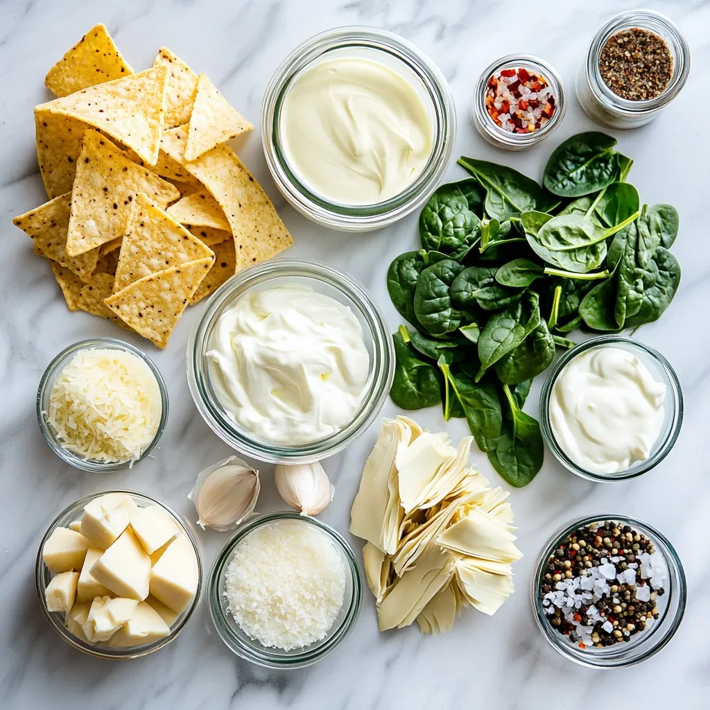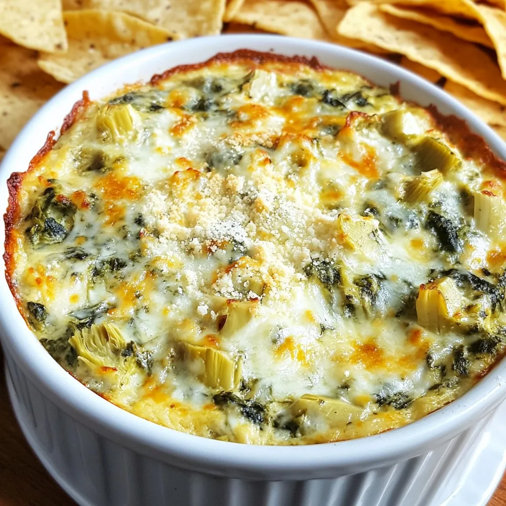 - 1 cup frozen spinach, fully thawed and excess moisture squeezed out - 1 can (14 oz) artichoke hearts, drained and coarsely chopped - 1 cup cream cheese, softened to room temperature - 1/2 cup sour cream - 1/2 cup mayonnaise - 1 cup shredded mozzarella cheese - 1/2 cup grated Parmesan cheese - 2 cloves garlic, finely minced - 1/2 teaspoon onion powder - 1/2 teaspoon optional red pepper flakes for heat - Salt and freshly ground black pepper to taste - Tortilla chips or sliced baguette for serving The cream cheese gives this dip a rich base. It creates a nice, creamy texture that blends well with other ingredients. Sour cream adds a slight tang, while mayonnaise boosts the creaminess. The mozzarella cheese melts beautifully, making it stretchy. Grated Parmesan brings a sharp, salty note. Garlic provides a punch of flavor, and onion powder adds depth. Red pepper flakes can add a nice touch of heat. Using frozen spinach is easy and saves time. Just thaw and squeeze out the moisture. Fresh spinach works too, but you need to cook it down first. Canned artichokes are great for this dip. They are tender and full of flavor. If you want, you can use fresh artichokes, but they require more prep work. Overall, frozen spinach and canned artichokes are best for quick and easy cooking. {{ingredient_image_2}} Start by gathering all your ingredients. You need frozen spinach, artichoke hearts, cream cheese, sour cream, mayonnaise, mozzarella, Parmesan, garlic, onion powder, salt, pepper, and optional red pepper flakes. First, preheat your oven to 350°F (175°C). This makes sure your dip bakes evenly. Next, take a large bowl. In it, mix the softened cream cheese, sour cream, and mayonnaise. Use a spatula or hand mixer. Keep mixing until it’s smooth with no lumps. Now, it's time to add the fun stuff. Fold in the thawed spinach and the chopped artichoke hearts. Then, toss in the minced garlic, mozzarella, and Parmesan cheese. Mix gently so everything combines well. Don’t forget to season the mixture! Add onion powder, optional red pepper flakes, salt, and pepper. Stir carefully until all flavors blend together. With your dip ready, spoon it into a greased baking dish. Use a spatula to smooth the top. This helps it bake evenly. Place the dish in your preheated oven. Bake for 25-30 minutes. Watch for bubbling and a nice golden brown top. This baking time ensures a creamy texture inside and a crispy top. Once baked, take the dish out of the oven carefully. Let it cool for a few minutes. This helps it set slightly, making it easier to scoop. Before serving, sprinkle some extra grated Parmesan cheese on top. Add a few sprigs of fresh parsley for color. Serve warm with tortilla chips or sliced baguette. Enjoy your creamy spinach artichoke dip! To make your dip creamy, start with softened cream cheese. If it’s too cold, it won’t blend well. Mix the cream cheese, sour cream, and mayonnaise until smooth. Use a hand mixer or spatula to avoid lumps. Fold in the spinach and artichokes gently. This keeps the texture light and airy. Seasoning is key for flavor. Use fresh black pepper and a good pinch of salt. I like to add onion powder for depth. If you want some heat, red pepper flakes work well. Taste your mixture before baking. Adjust the seasoning as needed. Oven times can vary. For most ovens, bake at 350°F for 25 to 30 minutes. Look for bubbles and a golden top. If your oven runs hot, check it at 20 minutes. If it’s cooler, it may need a few extra minutes. Always let it cool for a few minutes before serving. This helps set the dip perfectly. Pro Tips Use Fresh Spinach: For a vibrant flavor and texture, consider using fresh spinach instead of frozen. Just sauté it briefly before adding to the mixture. Customize the Cheese: Feel free to mix different types of cheese like cheddar or gouda for a unique flavor twist that suits your taste. Make Ahead: Prepare the dip a day in advance and store it in the refrigerator. Just bake it when you’re ready to serve! Serve with Variety: Besides tortilla chips, offer a selection of veggies like celery sticks or bell pepper slices for a healthier dipping option. {{image_4}} You can easily adapt this creamy spinach artichoke dip for various diets. Here are some options: - Gluten-Free: Use gluten-free tortilla chips or veggie sticks. - Dairy-Free: Replace cream cheese, sour cream, and mayo with plant-based alternatives. - Vegan: Choose vegan cheese and use nutritional yeast for a cheesy flavor. These adjustments still keep the dip rich and tasty! Want to spice up your dip? Consider these fun options: - Spicy Kick: Add more red pepper flakes or some diced jalapeños. - Herbs: Mix in fresh herbs like basil or cilantro for a fresh taste. - Cheese Variety: Swap mozzarella for pepper jack or gouda for a different flavor. These tweaks can make your dip unique and exciting! You can serve this dip for many events. Here are some ideas: - Parties: Pair it with tortilla chips and sliced baguette for easy snacking. - Game Day: Serve it with crunchy veggies like carrots and celery for a healthy touch. - Holidays: Add a festive garnish, like pomegranate seeds, for a pop of color. These serving ideas can fit any occasion and impress your guests! To store leftover spinach artichoke dip, follow these steps: - Let the dip cool to room temperature. - Place it in an airtight container. - Seal the container tightly to keep air out. - Store it in the fridge for up to four days. Keeping it in a sealed container helps maintain its creamy texture and flavor. Reheating your dip properly helps it taste fresh. Here’s how: - Oven Method: Preheat your oven to 350°F (175°C). Place the dip in an oven-safe dish and cover it with foil. Bake for about 15-20 minutes. Remove the foil for the last 5 minutes to get a nice top. - Microwave Method: Transfer the dip to a microwave-safe bowl. Heat it in short bursts, stirring in between, until hot. This method is quick but may change the dip's texture slight