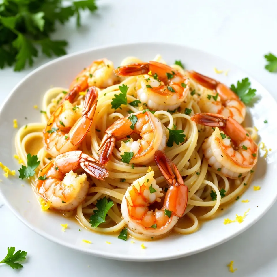 A delicious shrimp scampi dish with garlic and butter, served over linguine pasta.