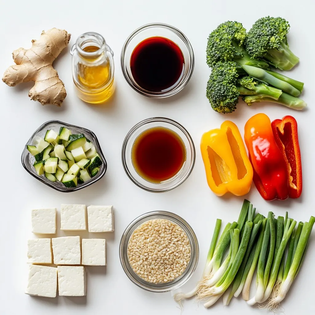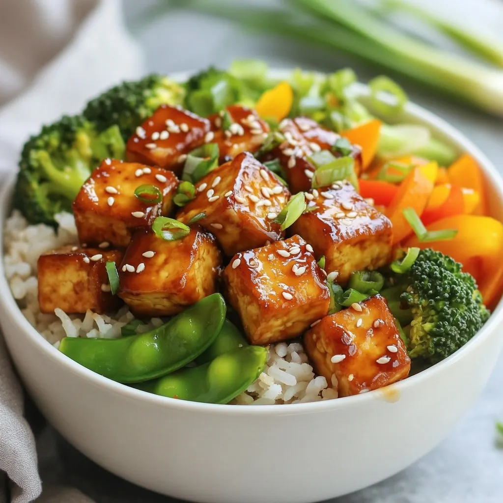 - 14 oz firm tofu, pressed and cubed - 3 tablespoons soy sauce - 2 tablespoons freshly grated ginger The star of this dish is firm tofu. It absorbs flavors well and adds protein. When you press the tofu, it releases extra water. This helps it get crispy when cooked. Soy sauce gives a salty and savory taste. Fresh ginger adds a zesty kick. Grating it fresh brings out its best flavor. - 1 cup brown rice or quinoa - 2 cups mixed vegetables (like bell peppers, broccoli, and snap peas) - 1 tablespoon sesame oil - 1 tablespoon olive oil Brown rice or quinoa serves as the base of your bowl. Both are hearty and healthy. Mixed vegetables add color and nutrients. You can use any veggies you like! Sesame oil and olive oil help cook the tofu and veggies. They also add rich flavors that make the dish shine. - 1 tablespoon honey or maple syrup - 1 tablespoon rice vinegar - 1 teaspoon sesame seeds - Chopped green onions Honey or maple syrup adds a touch of sweetness. Rice vinegar gives a nice tang. Sesame seeds and green onions are perfect for garnish. They add crunch and flavor to the final dish. You can mix and match these add-ins based on your taste! {{ingredient_image_2}} Start by cooking brown rice or quinoa. This is simple! Bring water to a boil, then add the grains. For brown rice, let it simmer for about 40-45 minutes. If you choose quinoa, it cooks faster, usually in 15-20 minutes. Both options provide a solid base for your bowls. Next, let’s make the ginger soy glaze. In a large bowl, whisk together the soy sauce, freshly grated ginger, honey or maple syrup, and minced garlic. This mix gives the dish its bold flavor. If you want more depth, try adding a splash of rice vinegar. It brightens the glaze! For the tofu, heat sesame oil and olive oil in a non-stick skillet over medium heat. Once hot, add the cubed tofu. Sauté for about 5-7 minutes. Turn the tofu gently to brown it evenly. You want a nice golden color for the best texture and taste. While the tofu cooks, prepare the vegetables. You can steam them for about 3-4 minutes until they are bright and tender-crisp. If you prefer, sauté them in a separate skillet with a splash of water or oil. Just be careful not to overcook them. You want to keep that crunch! Now it’s time to assemble your bowls. Start with a hearty scoop of rice or quinoa at the base. Then, layer on the ginger soy glazed tofu. Top it with a colorful mix of steamed vegetables. This adds both flavor and visual appeal. Finish with a drizzle of rice vinegar, a sprinkle of sesame seeds, and chopped green onions for that fresh crunch. Enjoy your beautiful meal! To get the best texture from your tofu, pressing is key. Start by wrapping your firm tofu in a clean kitchen towel. Place a heavy object on top, like a cast iron skillet, for 15 to 30 minutes. This will remove excess water and help the tofu absorb flavor. Marinade timing also matters. After pressing, cube the tofu and soak it in the ginger soy glaze for at least 30 minutes. This helps the tofu soak up the flavors. If you are in a hurry, even 10 minutes will make a difference. Want to spice things up? You can add a pinch of red pepper flakes or a splash of sriracha to the marinade. This will give your tofu a nice kick. Balancing sweetness and saltiness is crucial. If your glaze tastes too sweet, add a splash more soy sauce. If it’s too salty, mix in a touch of honey or maple syrup. Taste as you go to find the perfect balance. Batch cooking makes life easier. Cook extra rice or quinoa and store it in the fridge. You can also prep your mixed vegetables ahead of time. Just chop them and keep them in an airtight container. For busy days, store your tofu bowls separately. Keep the tofu, grains, and veggies in their own containers. This way, you can grab a healthy meal quickly. Pro Tips Press Tofu Well: Make sure to press the tofu for at least 30 minutes to remove excess moisture. This will help it absorb the flavors of the glaze better and achieve a crispier texture when sautéed. Use Fresh Ingredients: Freshly grated ginger and minced garlic will provide a much stronger flavor compared to pre-packaged versions. Always opt for fresh to elevate your dish! Customize Your Vegetables: Feel free to swap out the mixed vegetables for your favorites! Seasonal veggies like asparagus or zucchini can add a delightful twist to the bowl. Garnish Generously: Don't skip the garnishes! Green onions and sesame seeds not only add visual appeal but also enhance the flavor and texture of your dish. {{image_4}} For a gluten-free version of Ginger Soy Glazed Tofu Bowls, start by using gluten-free soy sauce. You can find this in most grocery stores. Next, swap brown rice for quinoa, which is naturally gluten-free. Quinoa adds a nice nutty flavor and boosts protein. You can also try using cauliflower rice for a low-carb option. For vegetables, bell peppers, broccoli, and snap peas work great. Feel free to mix in other veggies you love! This recipe is already vegan, but double-check the soy sauce. Some brands may have hidden ingredients. If you're allergic to soy, use coconut aminos instead. It has a similar taste without the soy. For sweeteners, maple syrup is a fantastic substitute for honey. If you have nut allergies, be cautious with oils. You can replace sesame oil with sunflower oil for safety. Want to spice things up? Add chili flakes or fresh jalapeños to the tofu while it cooks. This adds heat and a nice kick! You can also try different sauces. Swap soy sauce for teriyaki or hoisin for a sweet twist. If you're feeling adventurous, mix in a splash of peanut sauce for a creamy texture. Experiment with flavors to make this dish truly yours! To keep your ginger soy glazed tofu bowls fresh, use airtight containers. Glass or BPA-free plastic work well. Store your leftovers in the fridge. They will taste best if eaten within three days. To reheat tofu bowls, use a microwave or a skillet. If using a microwave, warm them in short bursts. Stir e