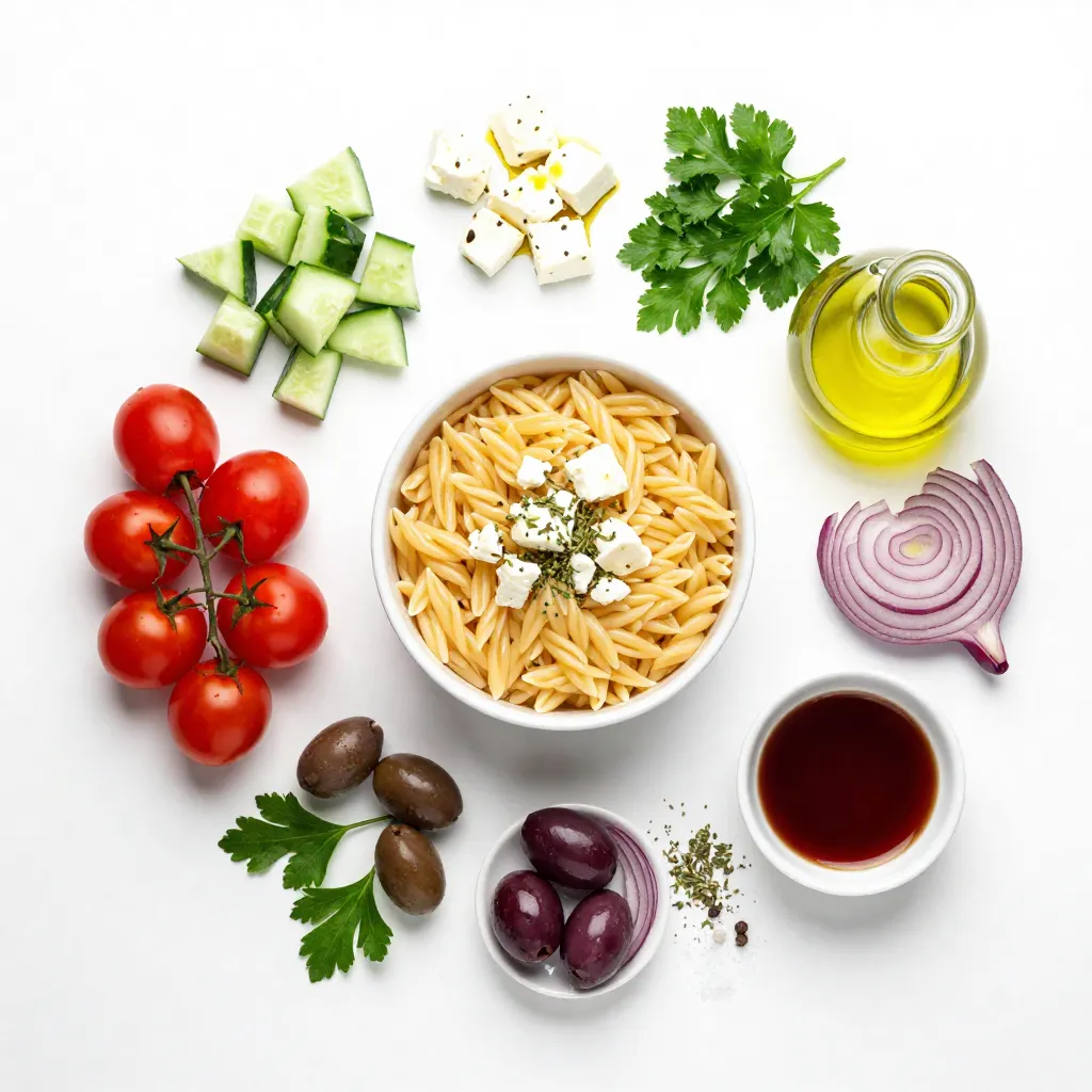 A refreshing salad featuring orzo pasta, fresh vegetables, feta cheese, and a zesty dressing.
