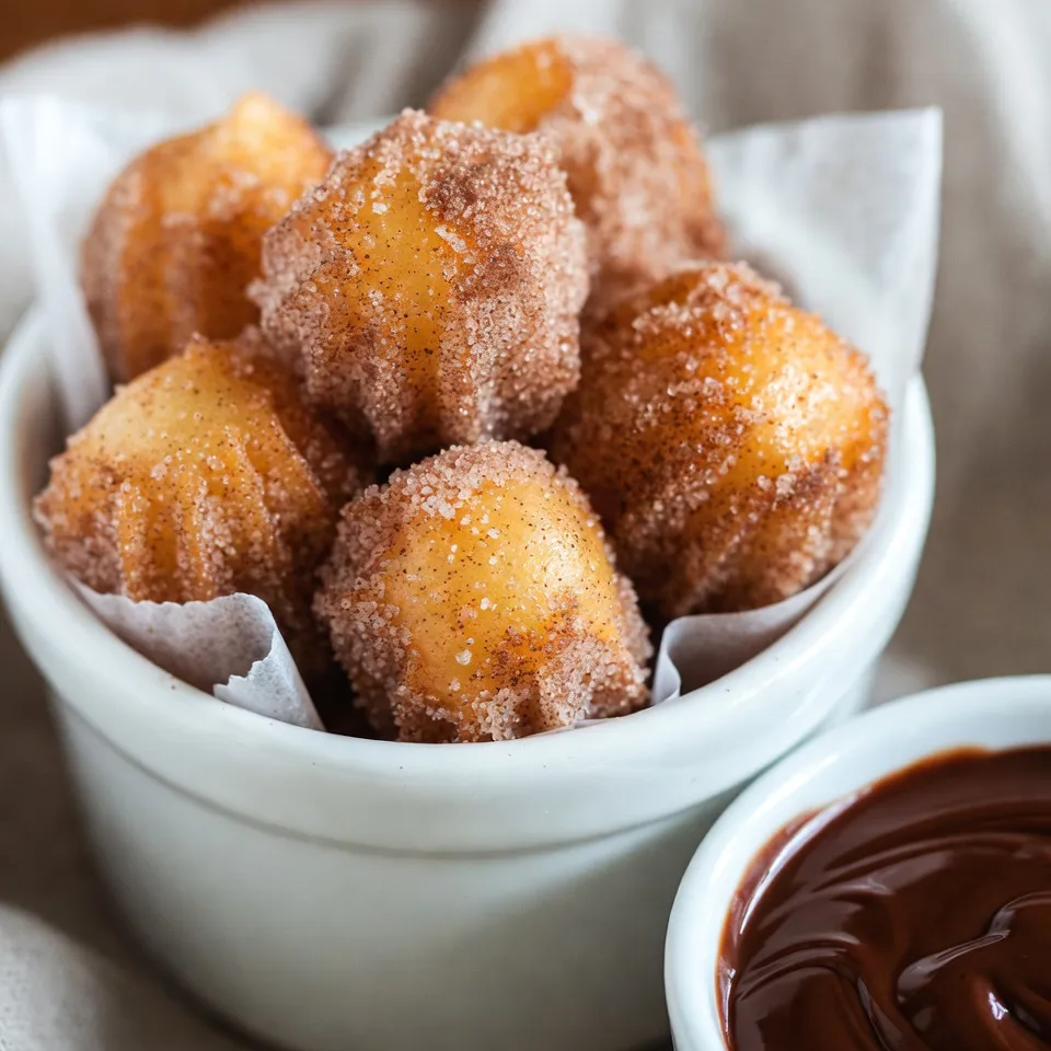 Delicious bite-sized churros coated in cinnamon sugar, perfect for a sweet treat.