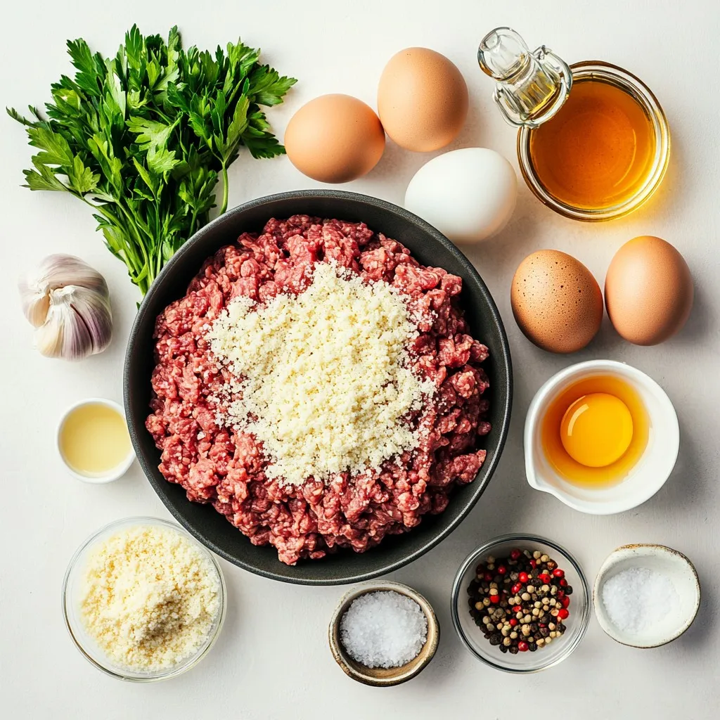 • In a large mixing bowl, combine the ground beef (or turkey), breadcrumbs, grated Parmesan cheese, beaten egg, minced garlic, chopped parsley, a pinch of salt, and a dash of black pepper. Mix gently until just combined.