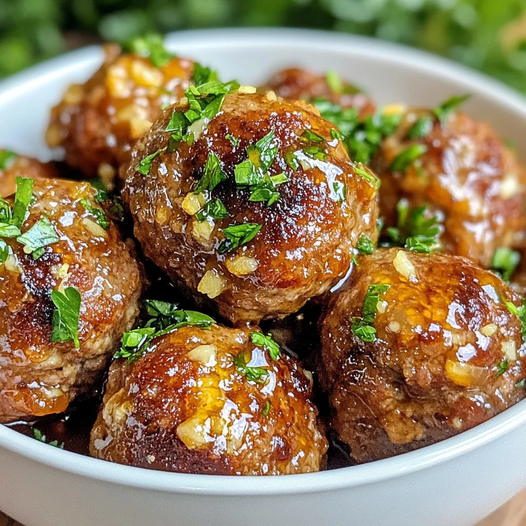 To make these tasty meatballs, you need a few key ingredients: - 1 pound ground beef (or ground turkey for a leaner option) - 1/2 cup breadcrumbs - 1/4 cup grated Parmesan cheese - 1 large egg, beaten - 2 cloves garlic, finely minced - 1 tablespoon fresh parsley, finely chopped - Salt and freshly ground black pepper, to taste These ingredients help create juicy meatballs full of flavor. You can mix and match to suit your taste. The glaze is what brings these meatballs to life. You will need: - 1/4 cup honey - 1/4 cup soy sauce (or tamari for gluten-free) - 1 tablespoon rice vinegar - 1 teaspoon crushed red pepper flakes (optional, for a touch of heat) This sweet and savory sauce adds a delightful finish to your meatballs. You can change some ingredients based on your needs or what you have at home: - Ground beef can switch to ground turkey, chicken, or even plant-based meat. - Breadcrumbs might be swapped with crushed crackers or oats. - If you lack Parmesan cheese, try any hard cheese or skip it altogether. - Use maple syrup instead of honey for a different sweet flavor. These swaps let you explore new tastes while keeping the recipe easy and fun. {{ingredient_image_2}} First, set your oven to 400°F (200°C). This step is key for nice, even cooking. Next, line a baking sheet with parchment paper. This helps with cleanup and keeps the meatballs from sticking. In a large bowl, combine the ground beef or turkey, breadcrumbs, Parmesan cheese, and the beaten egg. Add in the minced garlic and chopped parsley. Season with salt and pepper. Use your hands or a fork to mix. Be gentle to avoid tough meatballs. You want a nice, smooth mixture. Now it's time to shape your meatballs. Take a portion of the mixture and roll it into balls about 1 to 1.5 inches wide. Place them on your prepared baking sheet. Make sure to leave space between each ball. This allows them to cook evenly. Bake the meatballs for 18-20 minutes. They should be golden brown and reach the right temperature—160°F (70°C) for beef or 165°F (74°C) for turkey. While the meatballs bake, let’s make the glaze. In a small saucepan, mix the honey, soy sauce, rice vinegar, and crushed red pepper flakes if you want some heat. Heat this over medium-low heat, stirring often. You want the honey to melt and blend well with the other ingredients. Once your meatballs are done, transfer them to a large bowl. Drizzle the honey garlic glaze over the hot meatballs. Gently toss them to coat evenly in the sauce. This adds so much flavor! Serve the glazed meatballs warm. You can put them on a nice platter or keep them in the bowl for a casual look. If you want, drizzle extra glaze on top for a pretty touch. For a full meal, serve them over rice or noodles. They are also great as appetizers with toothpicks! To keep your meatballs moist, use ground beef or turkey with some fat. Fat adds flavor and keeps them juicy. Adding breadcrumbs helps too. They soak up moisture and keep the meatballs tender. You can also mix in grated cheese for extra richness. Lastly, do not overcook them. Baking until they are just done will keep them soft. To boost flavor, use fresh garlic and herbs. Fresh parsley adds a bright taste. Consider adding spices like onion powder or smoked paprika. These can make your meatballs more exciting. For a sweet touch, mix in a bit of brown sugar. It contrasts nicely with the honey glaze. A splash of Worcestershire sauce can also add depth. Be gentle when mixing your meatball ingredients. Overmixing can make them tough. Combine the ground meat with breadcrumbs and seasonings just until they come together. Use your hands or a fork for this. It's okay if some bits stay loose. Shaping them will help the meatballs hold together while baking. Pro Tips Use Lean Meat for Healthier Options: Opt for ground turkey instead of beef for a lighter version of these meatballs, reducing fat while keeping the flavor intact. Don’t Overmix: When combining the meatball ingredients, mix gently to avoid tough meatballs. Overmixing can lead to a dense texture. Adjust the Glaze to Your Taste: Feel free to modify the honey and soy sauce ratio in the glaze to achieve your preferred balance of sweetness and saltiness. Experiment with Herbs: Enhance the flavor by adding different fresh herbs like basil or cilantro to the meatball mixture for a unique twist. {{image_4}} I love using ground turkey in these meatballs. It adds a leaner twist while still keeping the flavor. Ground turkey has less fat than beef, making it a healthier choice. The method stays the same. Just swap the ground beef for turkey. You will still get that sweet and savory taste from the honey garlic glaze! For a gluten-free meal, use gluten-free breadcrumbs and tamari instead of soy sauce. Both changes keep the dish tasty and safe for gluten-sensitive friends. You can find gluten-free breadcrumbs at most grocery stores. This small swap allows everyone to enjoy these meatballs without worry. You can make these meatballs even better by adding veggies! Grated carrots or finely chopped spinach blend well into the meat mixture. They boost nutrition while keeping the meatballs moist. If you want to switch proteins, try ground chicken or pork. Each brings a unique flavor that pairs well with the honey garlic glaze. You can store leftover meatballs in an airtight container. This keeps them fresh for up to three days in your fridge. Make sure the meatballs cool first before sealing the container. This helps prevent moisture buildup, which can make them soggy. Freezing is a great option for longer storage. Place cooled meatballs in a single layer on a baking sheet. Freeze them for about one hour. Once frozen, transfer them to a freezer-safe bag. Label the bag with the date. They will stay good for up to three months. To reheat, you can use the oven or the microwave. For the oven, preheat it to 350°F (175°C). Place the meatballs on a baking sheet and heat for 10-15 minutes. If using the microwave, place 
