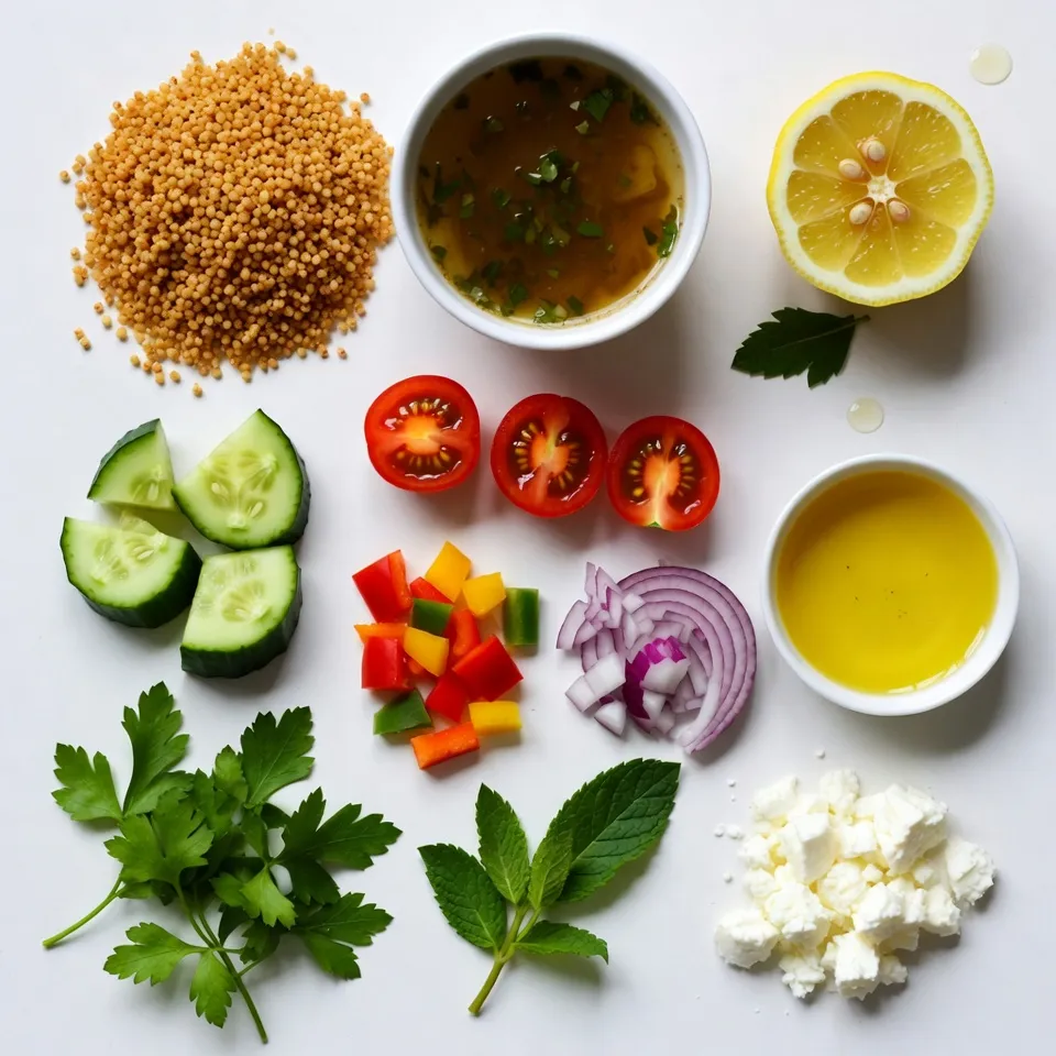 A refreshing salad featuring couscous, fresh vegetables, and a zesty lemon dressing.