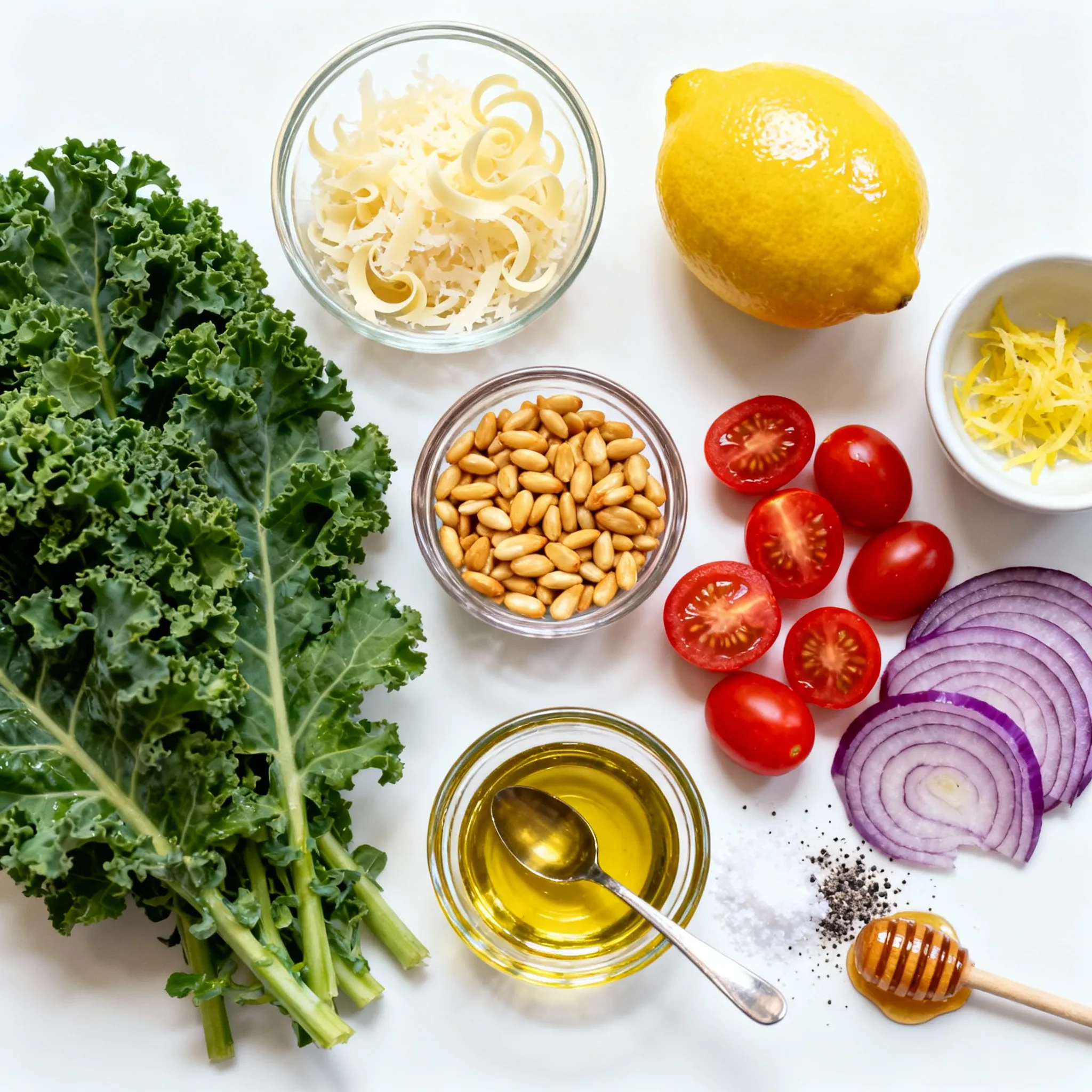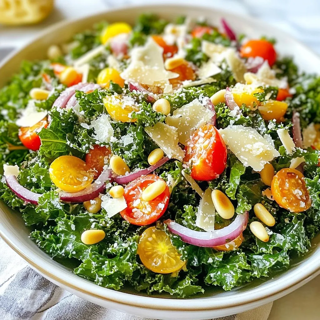 Kale is a superfood. It is packed with vitamins A, C, and K. These vitamins boost your immune system and support healthy bones. Parmesan cheese adds flavor and protein. It also gives calcium, which helps keep bones strong. Pine nuts offer healthy fats and protein. They can help keep you full longer. Cherry tomatoes are low in calories but high in vitamins. They add a sweet burst of flavor. Olive oil is a good fat that benefits heart health. Lemon juice brightens the salad and adds vitamin C.