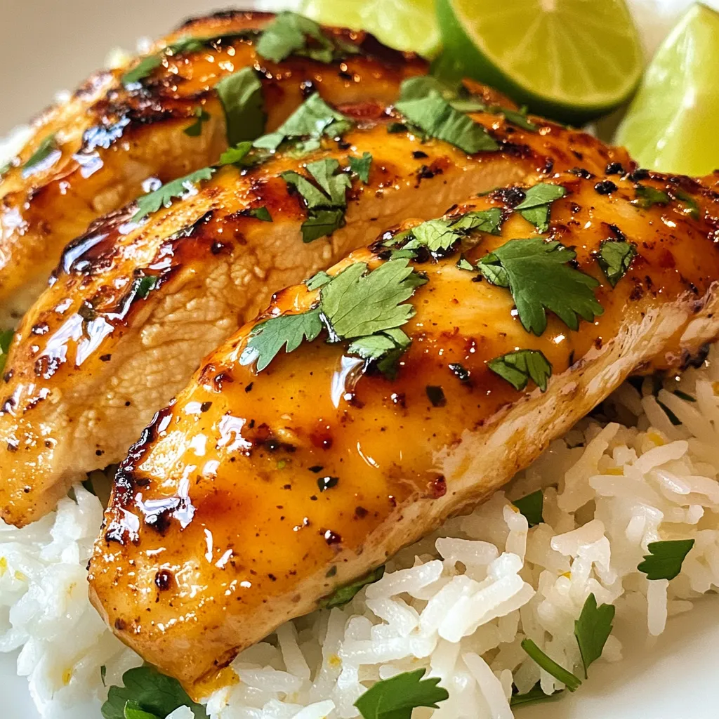 For a stunning plate, spoon creamy coconut rice onto each dish first. Slice the grilled chicken and place it over the rice. Add fresh cilantro on top for color. Lime wedges on the side add a fresh burst of flavor. Serving the chicken at an angle makes it look appealing. A sprinkle of lime zest can brighten the dish visually and tastefully. This will impress your guests and make every bite enjoyable!
