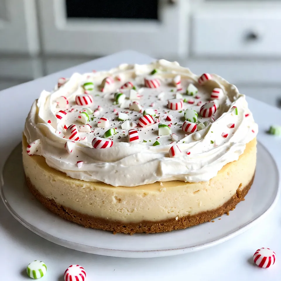 A festive cheesecake featuring creamy white chocolate and a hint of peppermint, perfect for holiday celebrations.