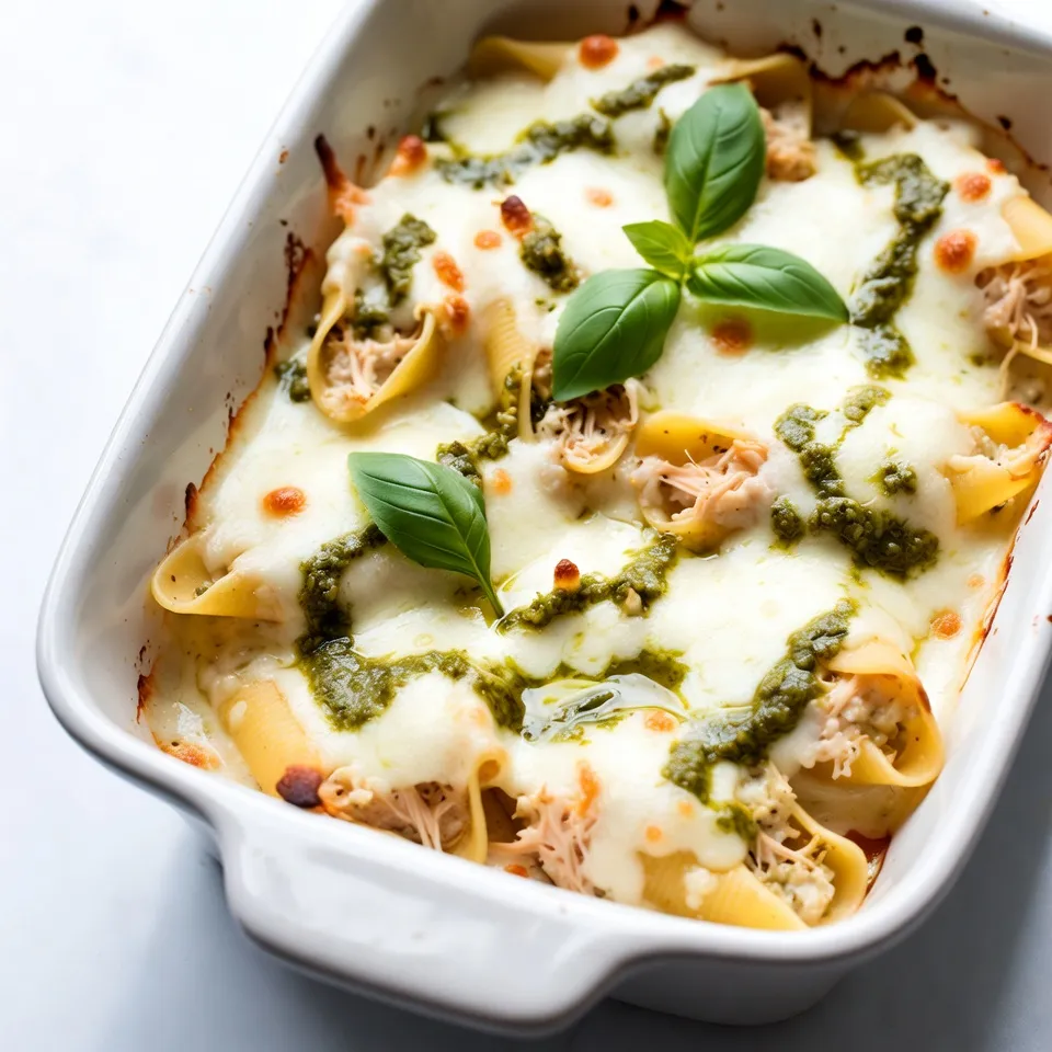 Delicious jumbo pasta shells filled with a creamy chicken and pesto mixture, baked to perfection.