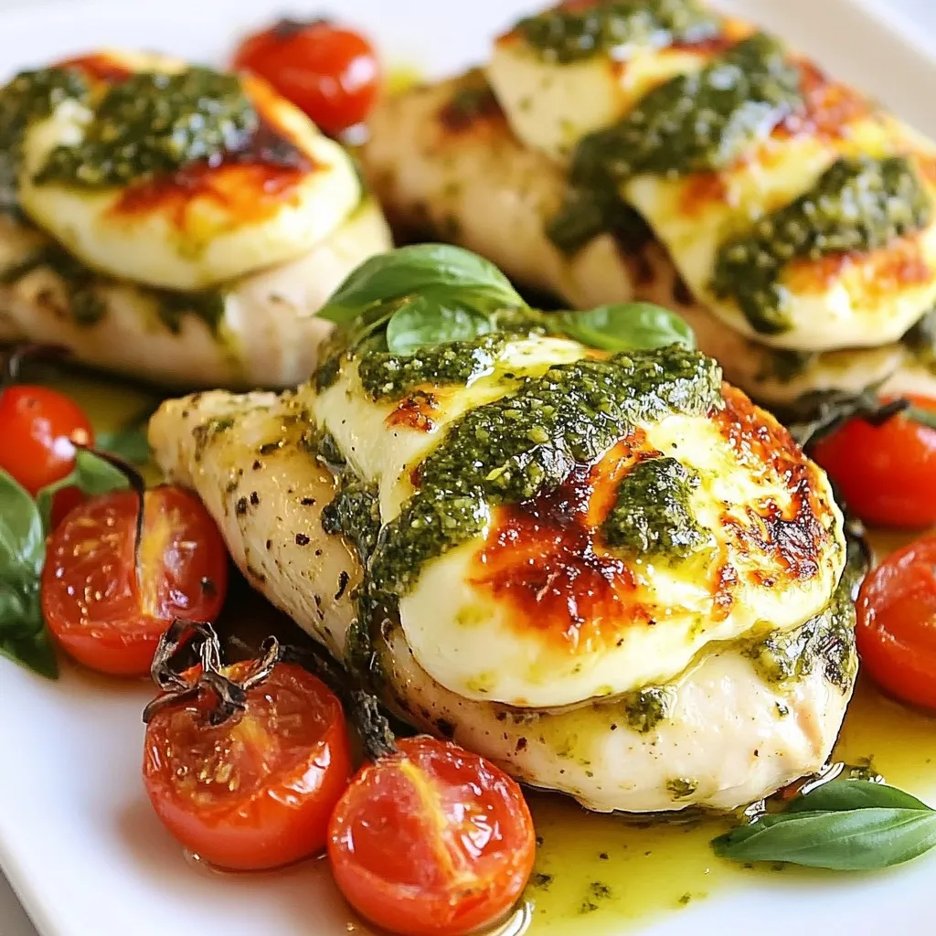 Delicious chicken breasts stuffed with pesto and mozzarella, baked to perfection.