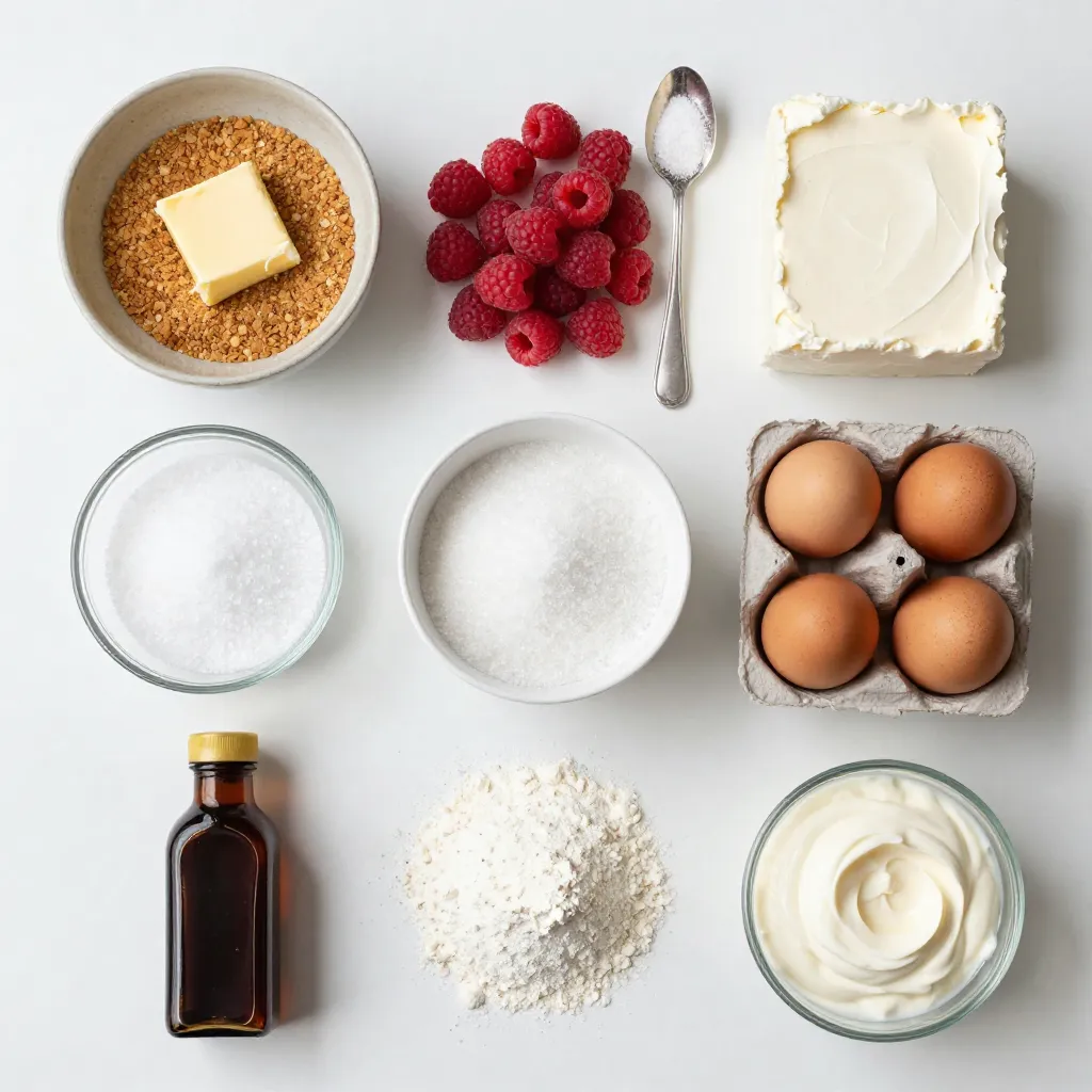 Gathering your ingredients is key to making a perfect raspberry swirl cheesecake. Start with the crust. You will need graham cracker crumbs and melted butter. This mixture gives your cheesecake a nice, crunchy base.