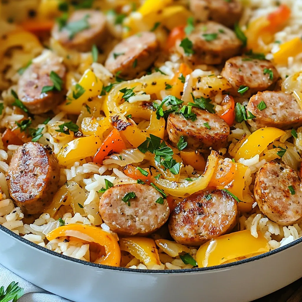 A flavorful one-pan dish featuring chicken sausage, rice, and vegetables, perfect for a quick dinner.