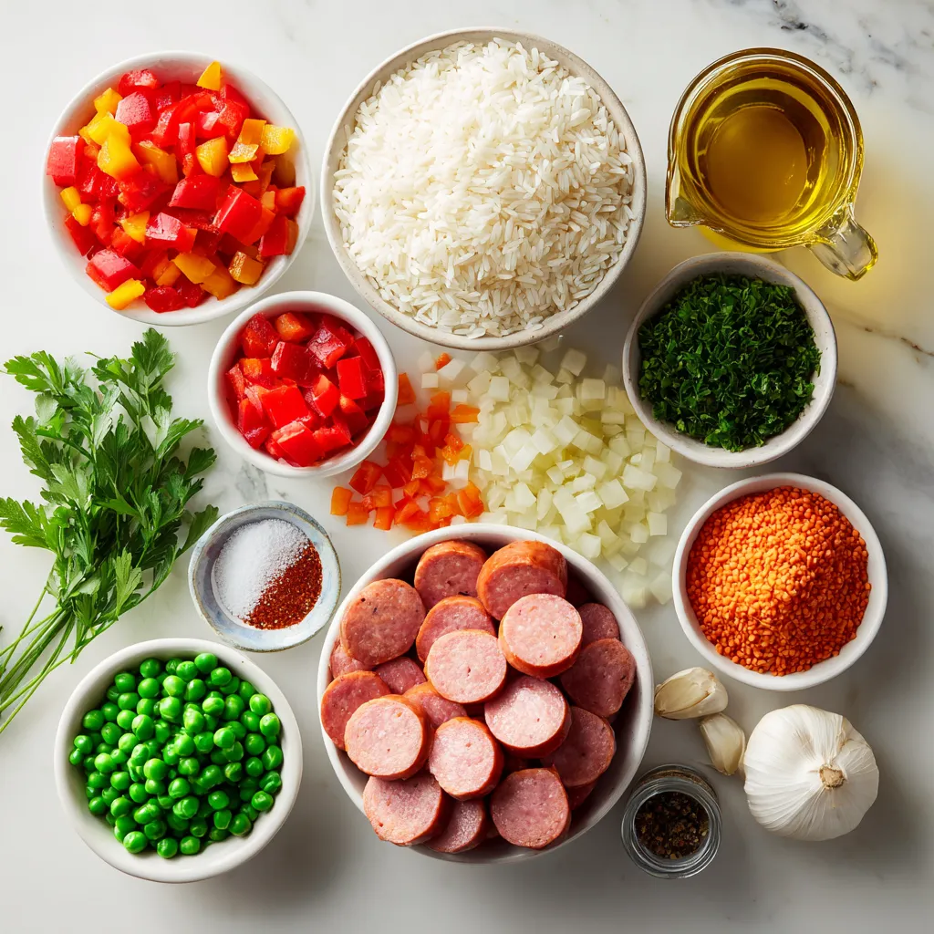 Gathering the right ingredients is key for a great meal. Chicken sausage adds protein and flavor. Long-grain white rice offers a fluffy base. Diced tomatoes bring moisture and a touch of sweetness.