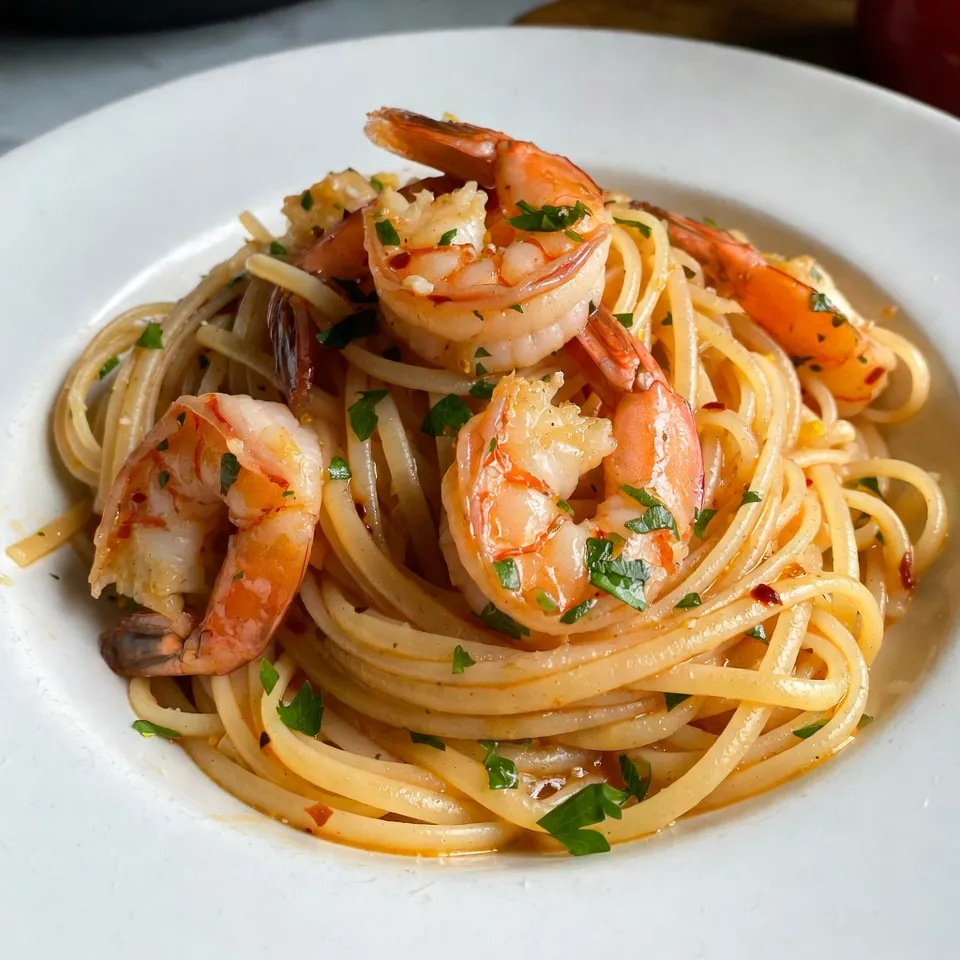 A delicious pasta dish featuring shrimp sautéed in garlic, butter, and olive oil, served with linguine.