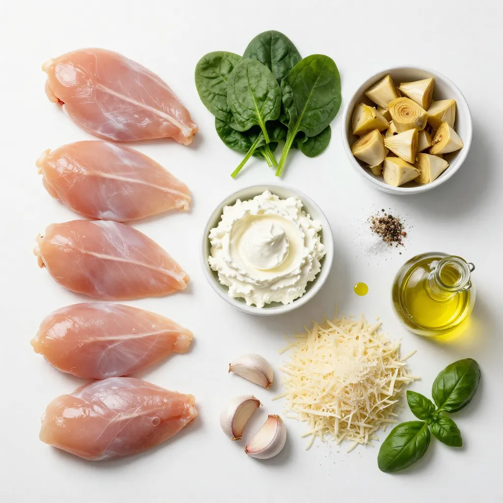 To make your Spinach Artichoke Stuffed Chicken, gather these ingredients. Each one plays a key role in building flavor. The chicken breasts provide a tasty base, while the spinach and artichokes add nutrition and zest. Cream cheese brings creaminess, and both parmesan and mozzarella offer a rich, cheesy finish.