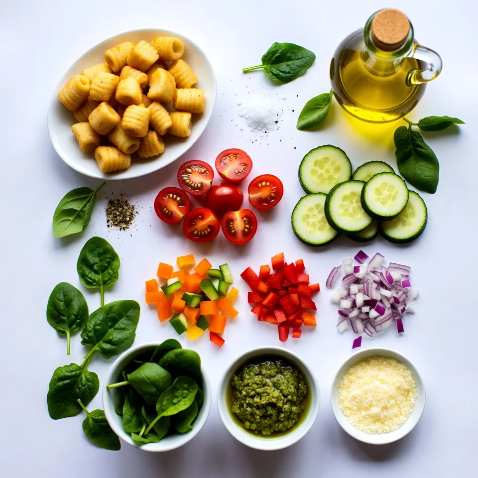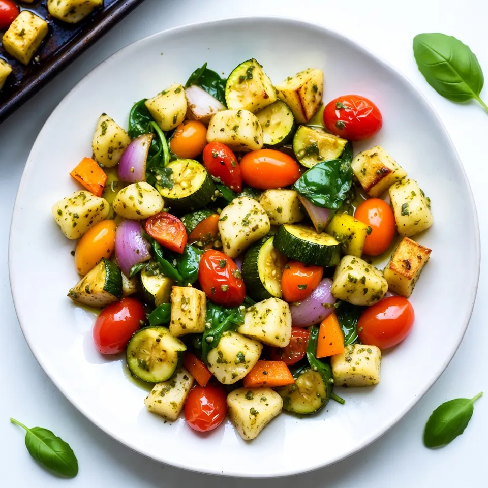 - 1 pound shelf-stable gnocchi - 1 cup cherry tomatoes, cut in half - 1 medium zucchini, sliced into half-moons - 1 bell pepper (your choice of color), diced into bite-sized pieces - 1 medium red onion, chopped - 2 cups fresh spinach, roughly chopped - 1/4 cup basil pesto - 3 tablespoons olive oil - Salt and pepper, to taste - Fresh basil leaves for garnish - Grated Parmesan cheese for serving (optional) This dish starts with gnocchi. Choose shelf-stable gnocchi for easy cooking. Gnocchi adds a soft, pillowy texture to the meal. Next, grab fresh veggies for color and taste. Cherry tomatoes bring sweetness. Zucchini adds a nice crunch. Bell pepper gives a pop of color. Red onion offers a sharp bite. You can also add fresh spinach. It wilts down nicely and adds a healthy touch. The basil pesto ties everything together. It adds a rich, herby flavor that makes this dish shine. Olive oil helps in roasting the veggies and gnocchi evenly. Don’t forget to season with salt and pepper. This step is key to enhancing the dish. For garnish, fresh basil leaves add a lovely aroma. If you want extra flavor, sprinkle grated Parmesan cheese before serving. It’s optional but highly recommended. {{ingredient_image_2}} Set your oven temperature to 425°F (220°C). This helps the dish cook evenly. Spread 1 pound of gnocchi, 1 cup of halved cherry tomatoes, 1 medium sliced zucchini, 1 diced bell pepper, and 1 chopped red onion on a large sheet pan. Make sure they are evenly spaced for even cooking. Drizzle 3 tablespoons of olive oil over the veggies and gnocchi. Add 1/4 cup of basil pesto on top. Season with salt and pepper to taste. Using your hands or a spatula, gently toss everything together. Arrange the mixture in a single layer on the sheet pan. Place it in the preheated oven and roast for 20-25 minutes. Stir halfway through for even browning. During the last 5 minutes, stir in 2 cups of roughly chopped spinach. This will wilt the spinach without overcooking it. Enjoy your vibrant, tasty meal! Even layering on the sheet pan is key for great roasting. When you spread the gnocchi and veggies evenly, they cook better. Each piece gets heat from the oven. If they’re piled too high, some won’t cook right. This can lead to soggy spots. Aim for a single layer. It helps everything brown nicely. You can boost the flavor in many ways. Try adding garlic powder or Italian herbs. A squeeze of lemon juice can add brightness too. For extra crunch, toss in nuts or seeds. If you love spice, add red pepper flakes. Don’t shy away from trying new toppings, like olives or artichokes. Fresh basil leaves on top bring freshness. Grated Parmesan cheese adds creaminess and richness. Experiment until you find your favorite mix! This dish is hearty but pairs well with sides. A simple green salad can balance the meal. Consider serving garlic bread for some crunch. You could also add a protein, like grilled chicken or shrimp, if you want. This way, you make it filling and satisfying. The options are endless, so choose what you love! Pro Tips Choose Your Veggies Wisely: Feel free to swap in your favorite seasonal vegetables for variety. Roasted carrots, asparagus, or broccoli would all work beautifully in this dish. Perfectly Crispy Gnocchi: Make sure to space the gnocchi and vegetables evenly on the sheet pan for optimal browning. Overcrowding can lead to steaming instead of roasting. Pesto Alternatives: If you don’t have basil pesto, try sun-dried tomato pesto or even a homemade herb blend for a unique twist on flavor. Serving Suggestions: This dish pairs wonderfully with a light salad or crusty bread. Consider adding a splash of lemon juice over the top before serving for a refreshing finish. {{image_4}} You can switch the veggies for this dish. Try using broccoli, asparagus, or carrots. These choices add different flavors and colors. You can even mix in some mushrooms or eggplant for a unique taste. Remember to cut them into similar sizes. This helps them cook evenly with the gnocchi. Want to boost the protein? You can easily add chicken, shrimp, or tofu. For chicken, cut it into bite-sized pieces. Toss them on the sheet pan with the veggies. For shrimp, use raw, peeled shrimp and add them in the last 10 minutes of cooking. If you prefer tofu, use firm tofu and cube it. Toss it in with the other ingredients to soak up the flavors. To make this dish vegan, skip the Parmesan cheese. Instead, use a vegan cheese or no cheese at all. Check for a vegan pesto if you want to keep the same flavor. Many brands offer plant-based pesto options. You can also add more veggies or beans for protein. This keeps the meal satisfying and delicious while staying plant-based. To store leftovers, let the dish cool first. Place it in an airtight container. You can keep it in the fridge for up to three days. If you want to save it longer, freeze it. Use a freezer-safe container and it can last up to three months. Make sure to label it with the date. This way, you can enjoy it later without worry. When you reheat, aim to keep the gnocchi soft. Use the oven if you can. Preheat it to 350°F (175°C). Spread the gnocchi and veggies on a baking sheet. Cover with foil to keep moisture in. Heat for about 15-20 minutes. You can also use a microwave. Place a portion in a bowl, add a splash of water, and cover. Heat for 1-2 minutes, stirring halfway through. For busy days, make this dish ahead of time. You can prep the veggies a day early. Cut and store them in the fridge in a sealed bag. You can also cook the gnocchi in advance. Just remember not to mix until you're ready to bake. Combine everything on the sheet pan just before roasting. This saves time and keeps flavors fresh. You can store leftovers in the fridge for up to three days. Use an airtight container to keep them fresh. If you want to store them longer, freeze them for up to two months. Just remember to let them cool completely before freezing. When you're ready to eat, thaw them overnight i