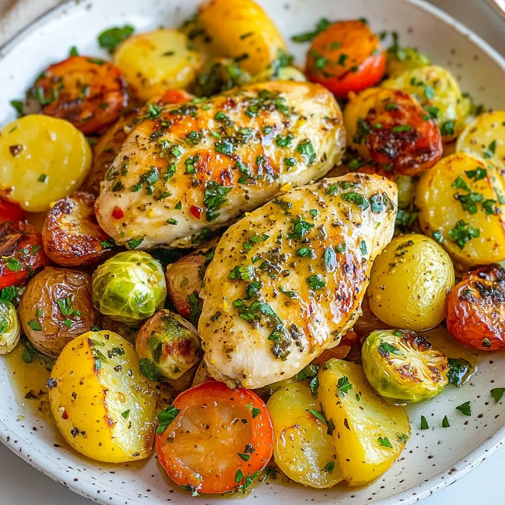 The chicken breasts are the star of this dish. They soak up the zesty marinade, making every bite flavorful. Fresh vegetables add color and crunch. I love using Brussels sprouts, baby potatoes, and bell peppers for their taste and texture. Garlic brings a delicious aroma and depth to the dish. The olive oil helps everything roast nicely.