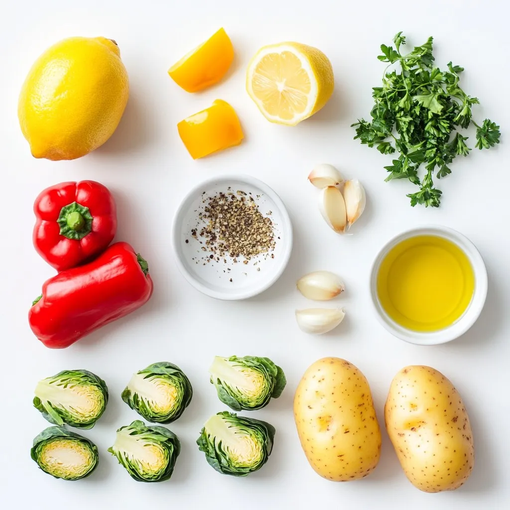 Prepare the Vegetables: In a separate bowl, toss the halved Brussels sprouts, quartered baby potatoes, and sliced bell peppers with a light drizzle of olive oil, as well as salt and pepper to taste.