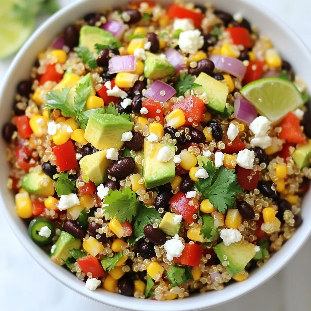 The main ingredients in this salad bring bright colors and bold flavors. Quinoa serves as the base, giving you protein and fiber. Black beans add heartiness and a nice texture. Corn brings sweetness, while the red bell pepper and jalapeño provide crunch and heat. The onion adds a sharp note, and avocado gives a creamy touch. Finally, cilantro adds freshness that ties everything together.