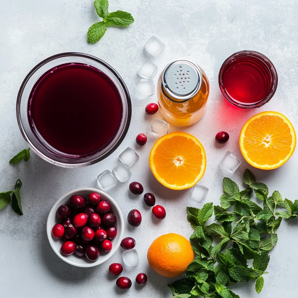 To start, gather your ingredients. You will need four cups of unsweetened cranberry juice. Next, measure two cups of sparkling water or club soda. Freshly squeeze one cup of orange juice. Keep half a cup of simple syrup at hand. You also need one cup of fresh cranberries, one orange for slicing, and a handful of mint leaves. Don’t forget the ice cubes!