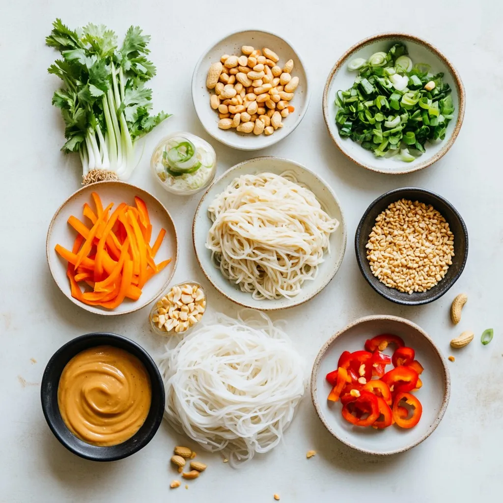 Rice noodles are the base of this dish. They are light and soak up flavors well. Creamy peanut butter brings richness and texture to the sauce. Soy sauce or tamari adds a salty umami kick.