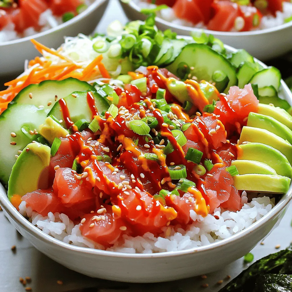 For a stunning sushi bowl, layer the ingredients neatly. Start with the seasoned sushi rice as the base. Next, add the spicy tuna mixture on top. Arrange sliced avocado, cucumber rounds, and shredded carrot around the tuna. Top with chopped green onions and sesame seeds for color. Drizzle extra sriracha for a pop of flavor. Serve with strips of seaweed for a fun touch. This way, each bite looks as good as it tastes.