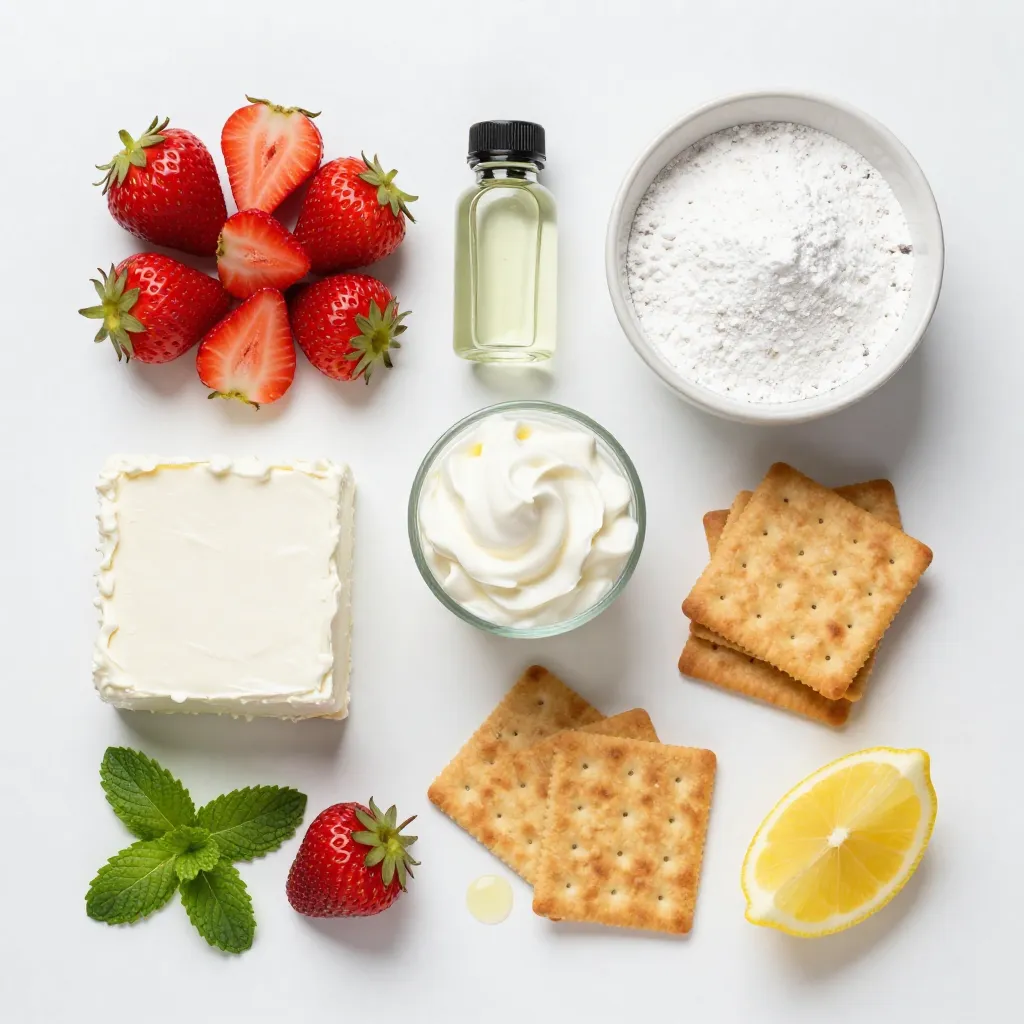 First, gather your ingredients. You need fresh strawberries, cream cheese, powdered sugar, and vanilla extract. You also need heavy whipping cream, graham crackers, and lemon juice.