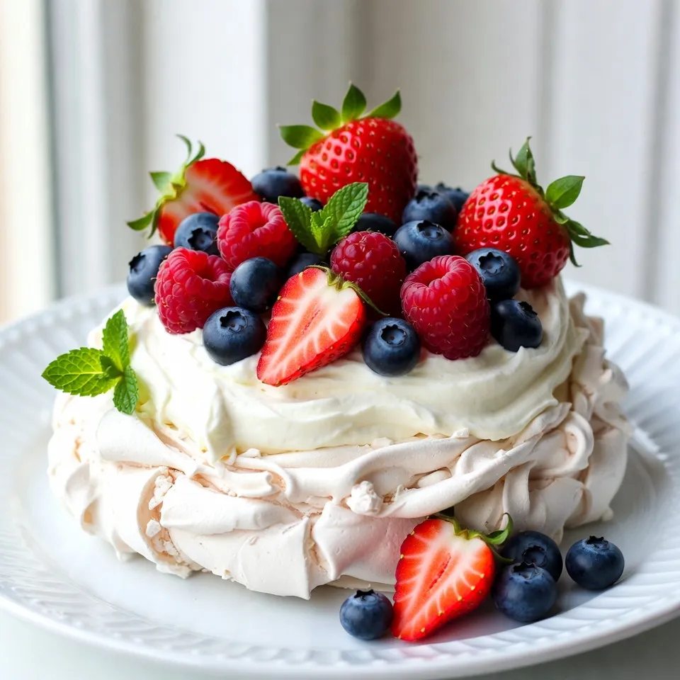 A light and airy pavlova topped with fresh mixed berries and whipped cream, perfect for summer.