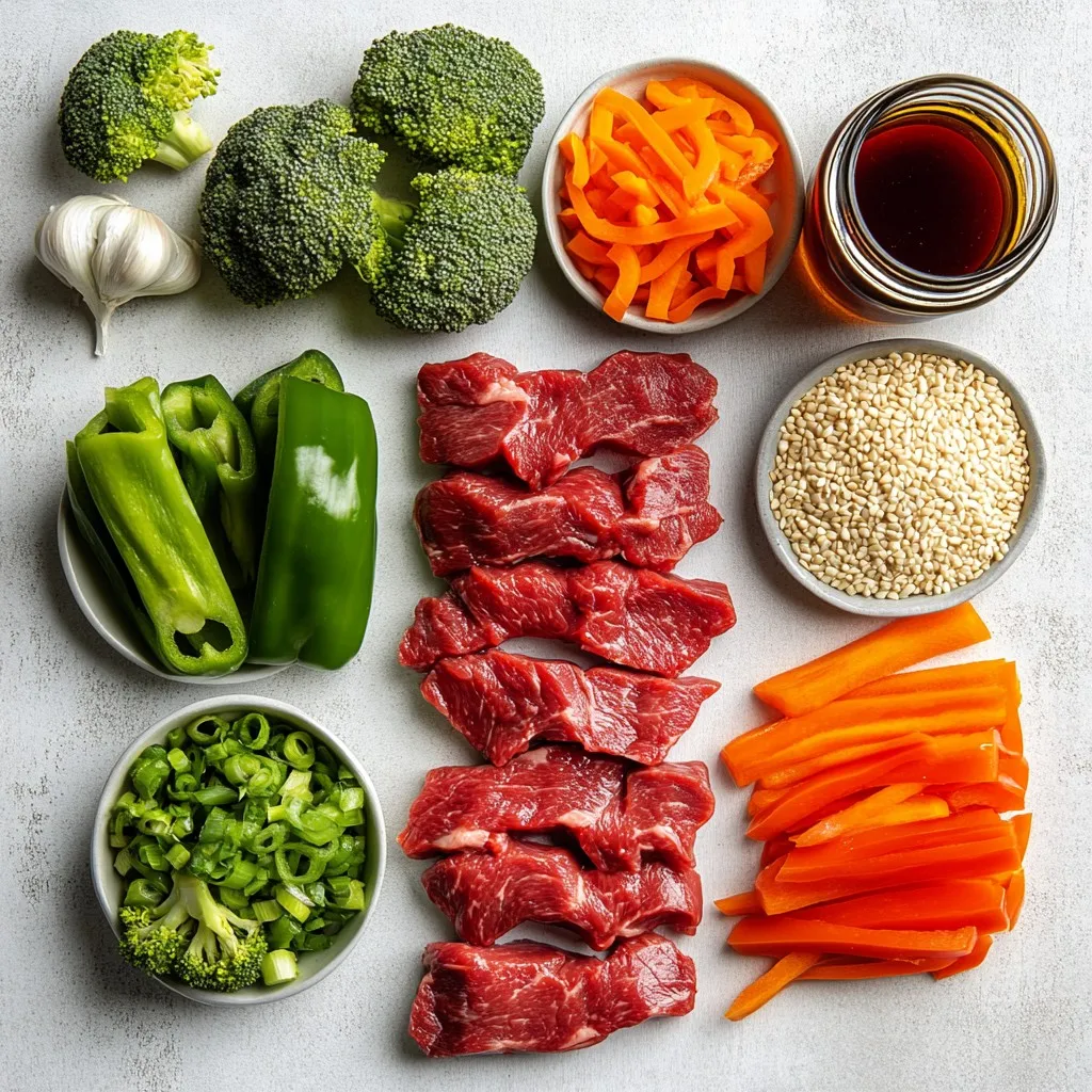The main ingredients shine in this dish. Beef sirloin gives you tender meat. The bell pepper adds a sweet crunch. Broccoli offers a nice texture and color. Carrots bring a touch of sweetness. Green onions add a fresh zing at the end.