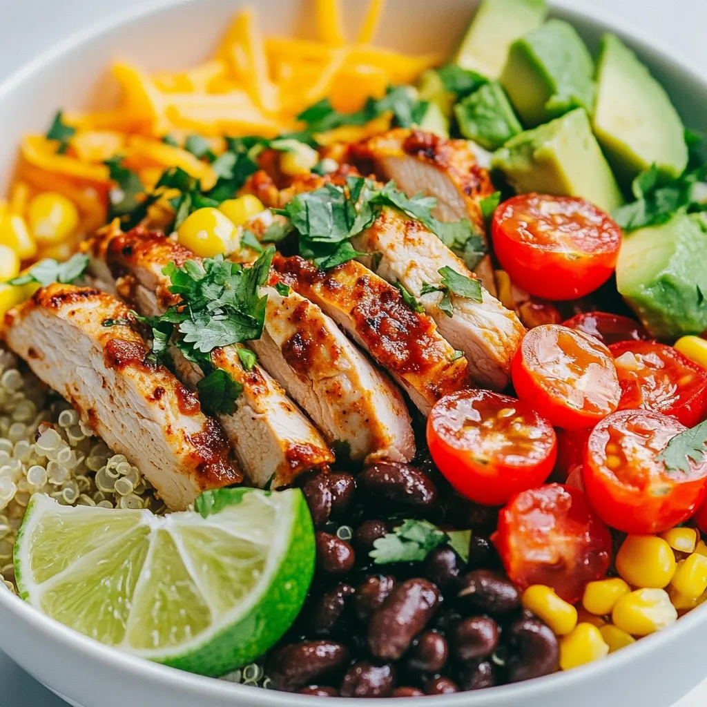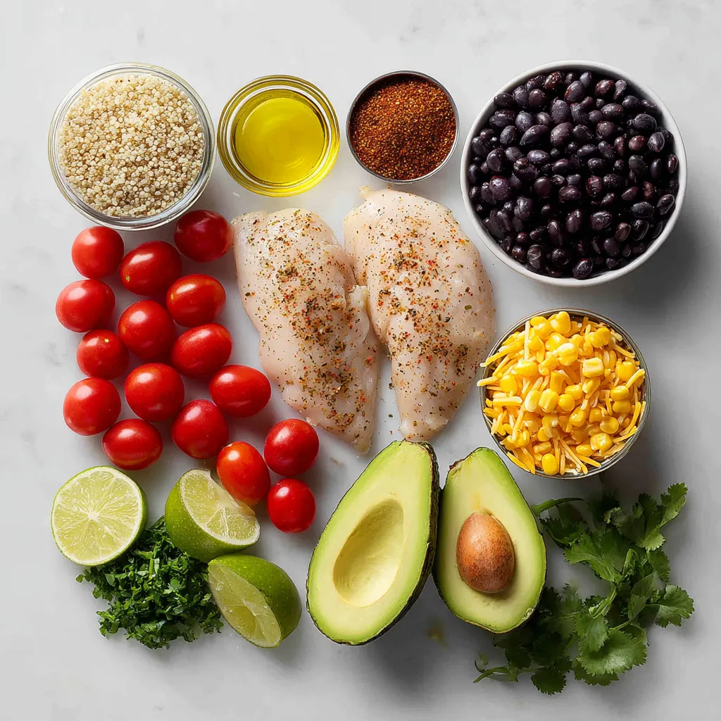 In my experience, these ingredients create a tasty Tex-Mex Chicken Quinoa Bowl. The quinoa serves as a great base. It provides protein and fiber. The chicken adds lean protein and can soak up the spices well. Black beans and corn bring in flavor and texture. Avocado adds creaminess and healthy fats.