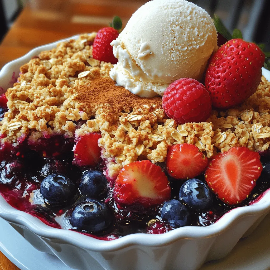 - 1 cup ripe strawberries, hulled and halved - 1 cup blueberries, fresh or frozen - 1 cup raspberries, fresh or frozen - 1/4 cup granulated sugar - 1 tablespoon cornstarch - 1 tablespoon fresh lemon juice - 1 cup rolled oats - 1/2 cup all-purpose flour - 1/2 cup brown sugar, tightly packed - 1/2 teaspoon ground cinnamon - 1/4 cup cold unsalted butter, cut into small cubes - A pinch of salt You can mix it up with different berries like blackberries or cherries. Swap in maple syrup for sugar. Add a splash of vanilla for extra flavor. Try using almond flour for a nutty taste. You can also sprinkle some chopped nuts on top for added crunch. If you run out of granulated sugar, use honey or agave syrup. Cornstarch can be replaced with arrowroot powder. Don’t have rolled oats? Quick oats work just fine. For a dairy-free option, use plant-based butter instead of unsalted butter. If you need gluten-free flour, almond flour or coconut flour can fit in well. First, preheat your oven to 350°F (175°C). This helps cook the crumble evenly. Next, grab a mixing bowl and add your berries: 1 cup of strawberries, 1 cup of blueberries, and 1 cup of raspberries. Add 1/4 cup of granulated sugar, 1 tablespoon of cornstarch, and 1 tablespoon of fresh lemon juice. Gently toss the mixture so the berries get coated. Let it sit for about 10 minutes. This time helps the berries release their juices and blend the flavors. While the berry mix rests, it’s time to make the crumble topping. In another bowl, combine 1 cup of rolled oats, 1/2 cup of all-purpose flour, and 1/2 cup of brown sugar. Add 1/2 teaspoon of ground cinnamon and a pinch of salt. Mix these dry ingredients well. Now, add 1/4 cup of cold, cubed unsalted butter to the bowl. Using your fingertips or a pastry cutter, work the butter into the dry mix until it looks like coarse crumbs. Make sure no large chunks of butter remain. Now, take an 8x8-inch baking dish and spread the berry mixture evenly across the bottom. This helps it bake properly. Next, sprinkle the crumble topping generously over the berries. Cover the mixture entirely to create that nice, crispy layer. Place the dish in your preheated oven and bake for 30-35 minutes. You want the topping to turn a lovely golden brown and for the fruit filling to bubble up at the edges. Once done, take it out and let it cool for about 10 minutes. This cooling helps thicken the filling, making it easier to serve. When you make a triple berry crumble, start with the right dish. I recommend using an 8x8-inch baking dish. This size helps the berries cook evenly. Layer the berry mix first. Make sure to spread it out well. This way, every bite gets fruit. To get a perfect crumble topping, keep your butter cold. Cut it into small cubes before mixing. Use your fingertips or a pastry cutter. This helps blend the butter until it looks like coarse crumbs. If you see big chunks, keep working it. The goal is a nice, crumbly texture to top the berries. Serve the crumble warm for the best taste. I love adding a scoop of vanilla ice cream on top. It melts a bit and tastes great with the warm fruit. For a fun touch, scatter fresh berries on the plate. It makes for a pretty display. You can also try whipped cream as a topping. Both ways make this dessert even better! {{image_4}} You can mix and match berries for your crumble. Try using blackberries, cherries, or even peaches. Each fruit brings its own taste and sweetness. Blackberries add a tart touch, while peaches lend a juicy flavor. Use what you like best or what you have on hand. This way, your crumble stays fresh and exciting. If you need a gluten-free version, swap regular flour for almond or coconut flour. Use certified gluten-free oats as well. For a vegan version, replace butter with coconut oil or vegan butter. These swaps keep the crumble tasty while meeting your needs. Enjoy your dessert without worry! Nuts can add a nice crunch. Try walnuts, almonds, or pecans in the topping. Just chop them fine and mix them in with the oats. You can also add spices like nutmeg or ginger for warmth. A dash of vanilla extract can elevate the taste too. These additions make your crumble unique and flavorful. To keep your Triple Berry Crumble fresh, let it cool completely. Then, cover it tightly with plastic wrap or foil. You can also transfer it to an airtight container. Store it in the fridge for up to three days. This way, you can enjoy it later without losing flavor. To reheat your crumble, preheat the oven to 350°F (175°C). Place the crumble in an oven-safe dish. Heat for about 15-20 minutes, or until it's warm. If you want to reheat individual servings, pop them in the microwave for about 30 seconds to 1 minute. If you want to save some for later, freezing works great. Allow the crumble to cool completely. Then, wrap it well in plastic wrap and foil. You can also place it in a freezer-safe container. It will stay good for about three months. When you’re ready to eat it, thaw it overnight in the fridge. Then, reheat as mentioned above. Enjoy your sweet treat anytime! Yes, you can use frozen berries. Frozen berries work well in this recipe. They save time and still taste great. Just make sure to let them thaw a bit before mixing. This can help them release their juices. If you use frozen berries, you might want to bake it a bit longer. To reheat Triple Berry Crumble, preheat your oven to 350°F (175°C). Place the crumble in an oven-safe dish. Cover it with foil to keep it moist. Heat it for about 15 to 20 minutes. You can also use a microwave. Heat it in short bursts for about 1 to 2 minutes. Check if it is warm throughout. You can store Triple Berry Crumble in the fridge for about 3 to 4 days. Make sure to cover it tightly with plastic wrap or foil. This helps keep it fresh. If you want to enjoy it later, consider freezing it for longer storage. You now know how to make a delicious Triple Berry Crumble. We covered the key ingredients, step-by-step instructions, and hel
