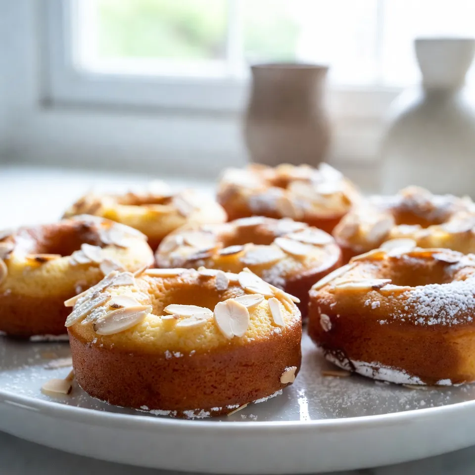 Deliciously soft and fluffy donuts infused with vanilla and almond flavors, topped with sliced almonds and a dusting of powdered sugar.
