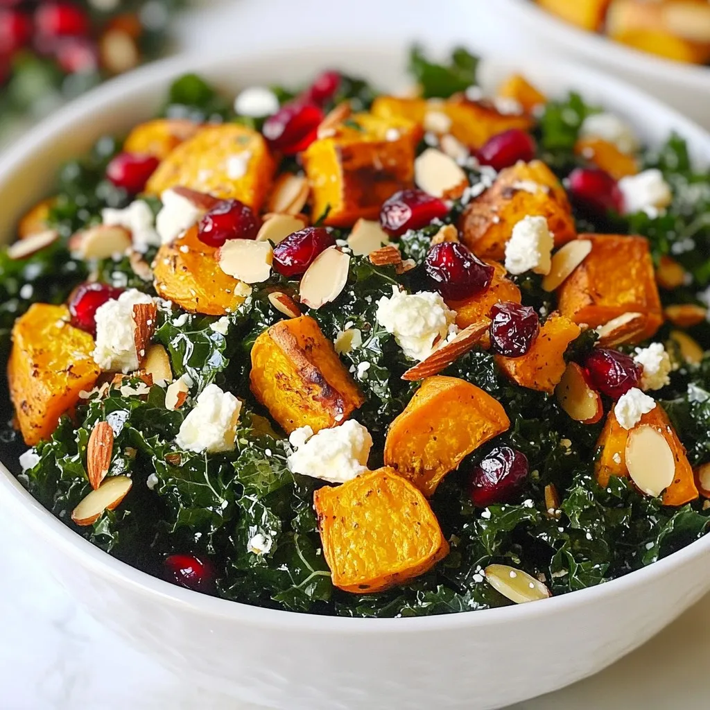 A vibrant and nutritious salad featuring fresh kale, roasted sweet potatoes, and a tangy dressing.