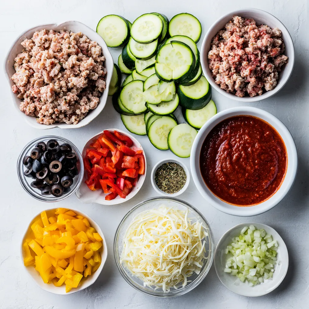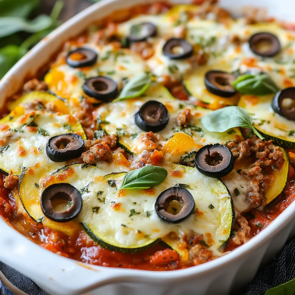 - 4 medium zucchini, sliced into thin rounds - 1 lb ground turkey or chicken - 1 cup pizza sauce - 1 cup shredded mozzarella cheese - 1/2 cup sliced black olives - 1/2 cup diced bell peppers - 1/2 cup finely chopped onion - 2 cloves garlic, minced - 1 teaspoon dried oregano - 1 teaspoon dried basil - 1/2 teaspoon red pepper flakes - Salt and pepper to taste - 1/2 cup grated Parmesan cheese Zucchini is the star of this dish. I love how its mild taste absorbs flavors well. You can choose any color of bell pepper. Each adds a pop of color. Ground turkey or chicken keeps this dish light. You can swap it for your favorite protein too. Pizza sauce is key for that familiar taste. You can use store-bought or make your own. I recommend using fresh garlic and onion. They add depth and warmth. The black olives provide a briny bite. Don't skip the seasoning! Oregano and basil bring that Italian flair. Red pepper flakes add a nice kick. Lastly, the cheese! Mozzarella gives that gooey texture. Parmesan adds a rich finish. Together, these ingredients create a fun and easy meal. {{ingredient_image_2}} Set your oven to 375°F (190°C). Preheating ensures that your casserole cooks evenly. If you skip this step, your dish may not cook well. In a skillet, heat one tablespoon of olive oil over medium heat. Add finely chopped onion and minced garlic. Cook for 3 to 4 minutes until the onions are soft and clear. This step fills your kitchen with a tasty smell. Add ground turkey or chicken to the skillet. Use a spatula to break it up as it cooks. Cook for about 5 to 7 minutes until the meat is browned and not pink. Season it with salt, pepper, oregano, basil, and optional red pepper flakes. Stir to mix all the flavors. In a large bowl, mix the sliced zucchini rounds with a little salt. Let them sit for 10 minutes. This helps pull out extra water, making your dish less soggy. After 10 minutes, pat the zucchini slices dry with a paper towel. Grab a rectangular casserole dish to build your layers. Start by spreading half the pizza sauce on the bottom. Add half of the cooked meat next. Layer half of the zucchini slices on top, followed by half of the black olives, bell peppers, and one-third of the mozzarella cheese. Repeat this layering, ending with the last bit of pizza sauce and mozzarella. Cover the dish tightly with aluminum foil. Bake it in the preheated oven for 25 minutes. After that, take off the foil and bake for another 15 to 20 minutes. You want the cheese to be bubbly and golden. Once done, cool the casserole for about 5 minutes to make slicing easier. To ensure even cooking, always preheat your oven. This helps everything cook uniformly. When layering the casserole, start with a thin layer of sauce. This layer keeps the bottom moist. Sauté the ground meat until brown. This gives a nice flavor base. Avoid soggy zucchini by salting your slices. Let them sit for ten minutes to draw out moisture. After that, pat them dry with a paper towel. This step is key to a great texture. For presentation, cut the casserole into squares. Arrange them on plates and add a garnish. Fresh basil leaves add a pop of color. Drizzle extra pizza sauce around the plate for flair. This enhances the meal's look and flavor. Pair the casserole with a simple side salad. A mix of greens and a light vinaigrette works well. Garlic bread also makes a great side, adding crunch and flavor. If you want an alternative for ground meat, try lentils or mushrooms. Both options add great flavor and texture. You can also use tofu for a vegetarian twist. For a low-carb option, stick to zucchini as your base. You can use cauliflower rice instead of grains. This keeps your meal light and healthy while still being tasty. Pro Tips Use Fresh Zucchini: Select firm, fresh zucchini for the best texture and flavor. Look for ones that are medium-sized and have smooth skin. Customize Your Toppings: Feel free to get creative with toppings! Add your favorite veggies or meats to personalize the casserole to your taste. Let It Rest: Allow the casserole to cool for a few minutes before slicing. This helps the layers set, making it easier to serve. Make It Ahead: This casserole can be assembled a day in advance and stored in the fridge. Just bake it when you’re ready to enjoy! {{image_4}} You can swap meat for plant-based options. Try using lentils, mushrooms, or tempeh. These choices add texture and flavor. You can also mix in extra veggies. Spinach, zucchini flowers, or artichokes work great. This adds color and nutrition. For those who love heat, add more spice! Red pepper flakes are a solid choice. Try jalapeños for a fresh kick. You might also enjoy adding hot sauce in your layers. These spices will transform your dish into a fiery delight. Cheese can change the whole taste! Instead of mozzarella, consider using provolone or gouda. These cheeses offer a smoky flavor. You can also mix in feta for a tangy twist. Each cheese adds its own unique touch. Feel free to experiment with your favorites! To store leftover zucchini pizza casserole, let it cool first. Place it in an airtight container. It stays fresh in the fridge for up to 4 days. If you want the best taste, eat it sooner. For long-term storage, freeze the casserole. Cut it into portions before freezing. Wrap each piece in plastic wrap and foil to prevent freezer burn. It lasts up to 3 months in the freezer. When ready to eat, thaw it overnight in the fridge. You can also thaw it in the microwave if you’re in a hurry. To keep the texture nice, reheating in the oven works best. Preheat the oven to 350°F (175°C) and place the casserole in a baking dish. Cover it with foil to avoid drying out. Warm it for about 20 minutes. If you use the microwave, heat it in short bursts. Check it often to keep it from getting too hot. This way, it stays soft and tasty. To make this dish gluten-free, you can switch the pizza sauce. Look for a brand that is clearly labeled as gluten-free. You can also make your own s
